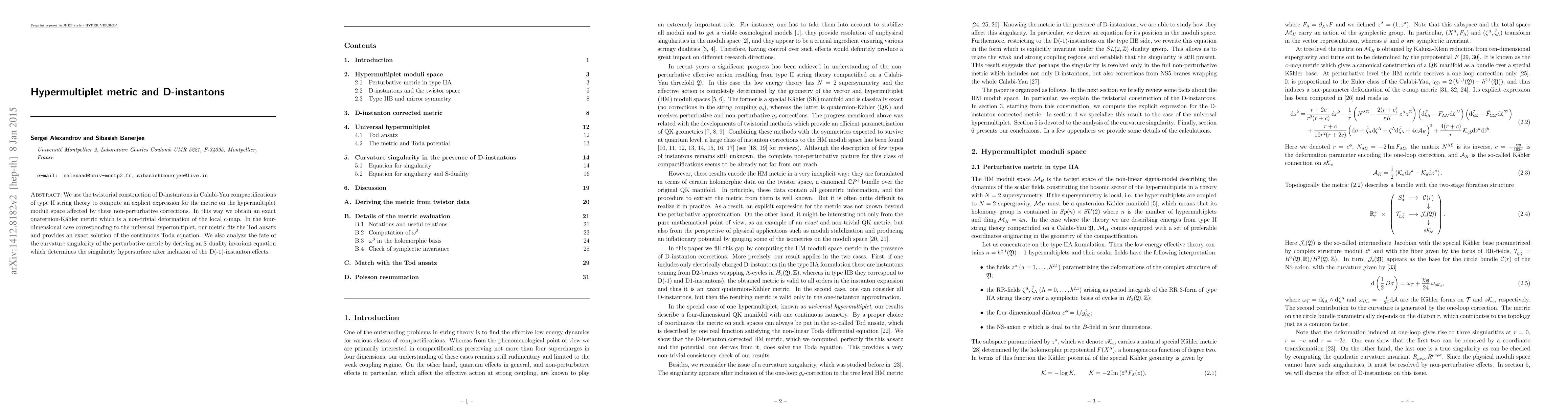 The paper computes an explicit metric on hypermultiplet moduli space in Calabi-Yau compactifications, incorporating D-instanton effects, yielding an exact quaternion-Kahler metric that deforms the local c-map and fits the Tod ansatz for the universal hypermultiplet. It also derives an S-duality invariant equation to determine the singularity hypersurface post D(-1)-instanton inclusion.