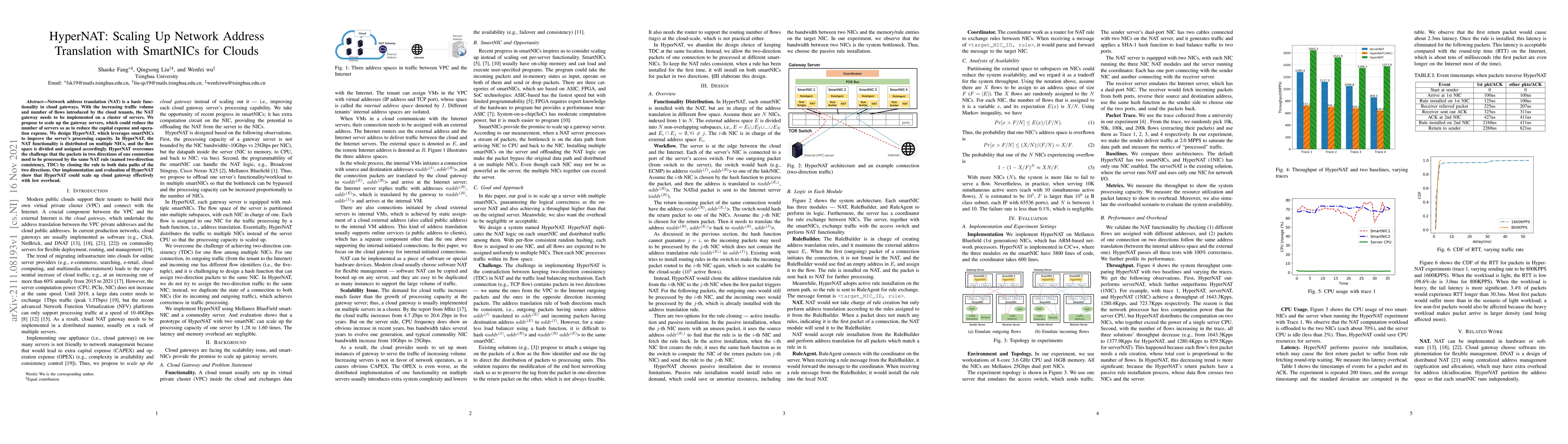 HyperNAT scales up network address translation in clouds by leveraging smartNICs to improve processing capacity, achieving low overhead while scaling cloud gateways effectively.