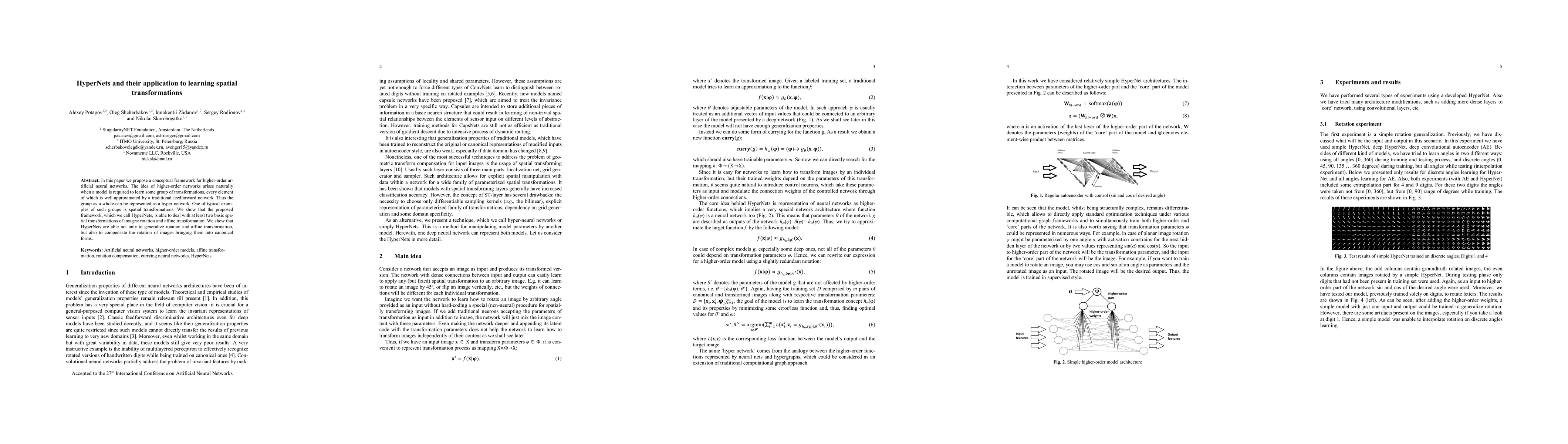 In this paper we propose a conceptual framework for higher-order artificial neural networks. The idea of higher-order networks arises naturally when a model is required to learn some group of transformations, every element of which is well-approximated by a traditional feedforward network. Thus the group as a whole can be represented as a hyper network. One of typical examples of such groups is spatial transformations. We show that the proposed framework, which we call HyperNets, is able to deal with at least two basic spatial transformations of images: rotation and affine transformation. We show that HyperNets are able not only to generalize rotation and affine transformation, but also to compensate the rotation of images bringing them into canonical forms.