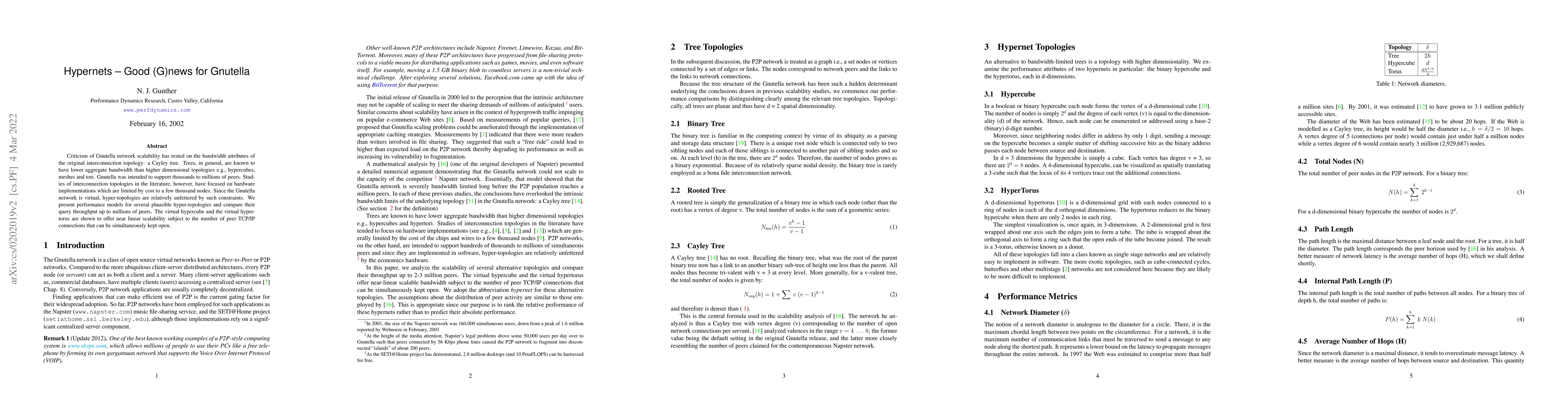 Criticism of Gnutella network scalability has rested on the bandwidth attributes of the original interconnection topology: a Cayley tree. Trees, in general, are known to have lower aggregate bandwidth than higher dimensional topologies e.g., hypercubes, meshes and tori. Gnutella was intended to support thousands to millions of peers. Studies of interconnection topologies in the literature, however, have focused on hardware implementations which are limited by cost to a few thousand nodes. Since the Gnutella network is virtual, hyper-topologies are relatively unfettered by such constraints. We present performance models for several plausible hyper-topologies and compare their query throughput up to millions of peers. The virtual hypercube and the virtual hypertorus are shown to offer near linear scalability subject to the number of peer TCP/IP connections that can be simultaneously kept open.