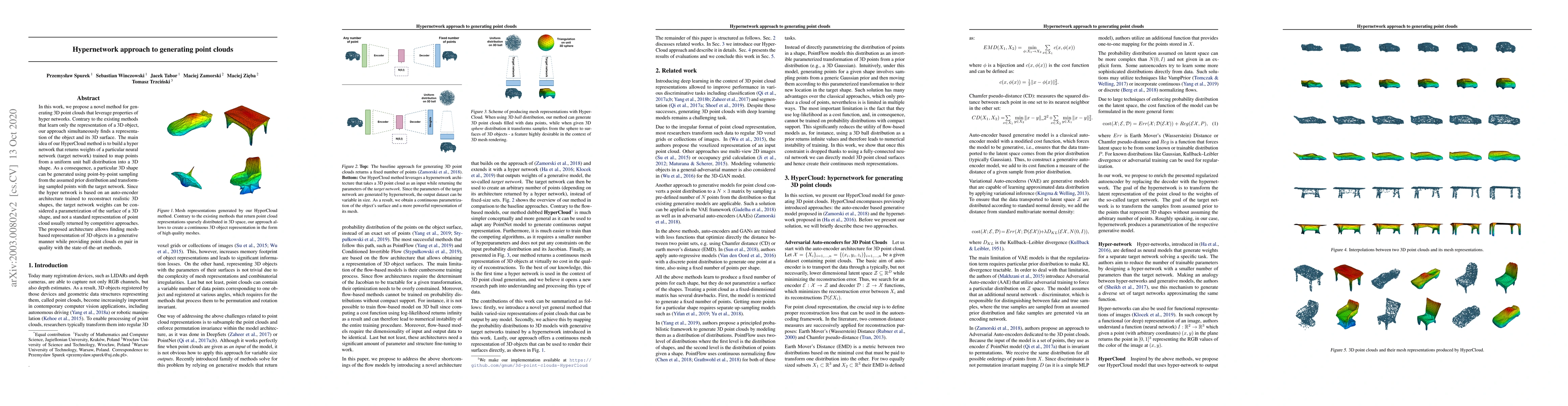A new method called HyperCloud uses hyper networks to generate 3D point clouds that represent both an object and its surface, improving upon existing methods in quality and representation.