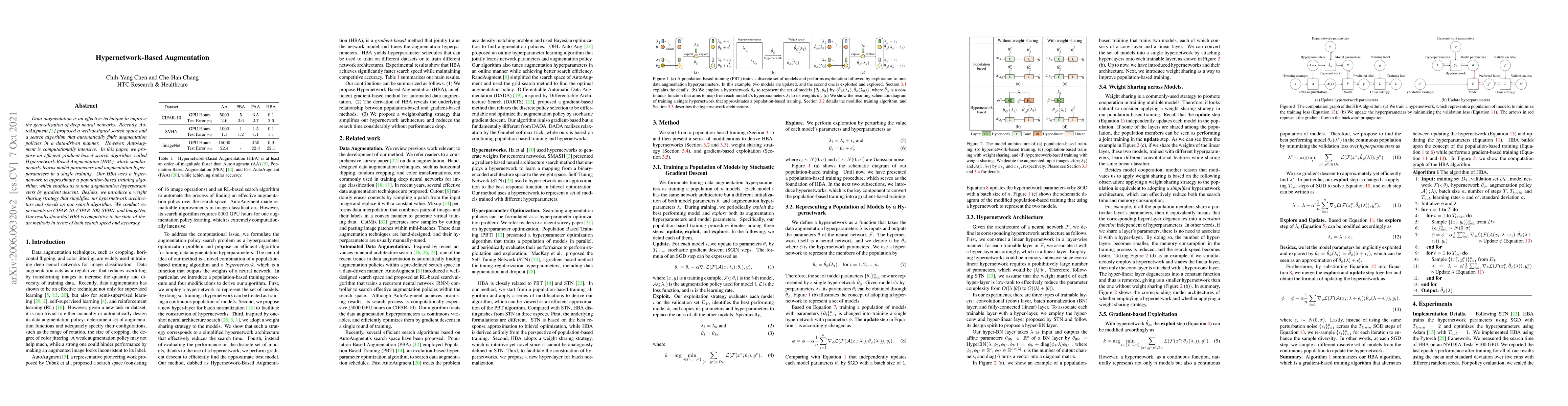 This paper proposes Hypernetwork-Based Augmentation (HBA), an efficient gradient-based search algorithm that learns model parameters and augmentation hyperparameters simultaneously. It uses a hypernetwork to approximate population-based training, enabling faster search and weight sharing for improved speed.