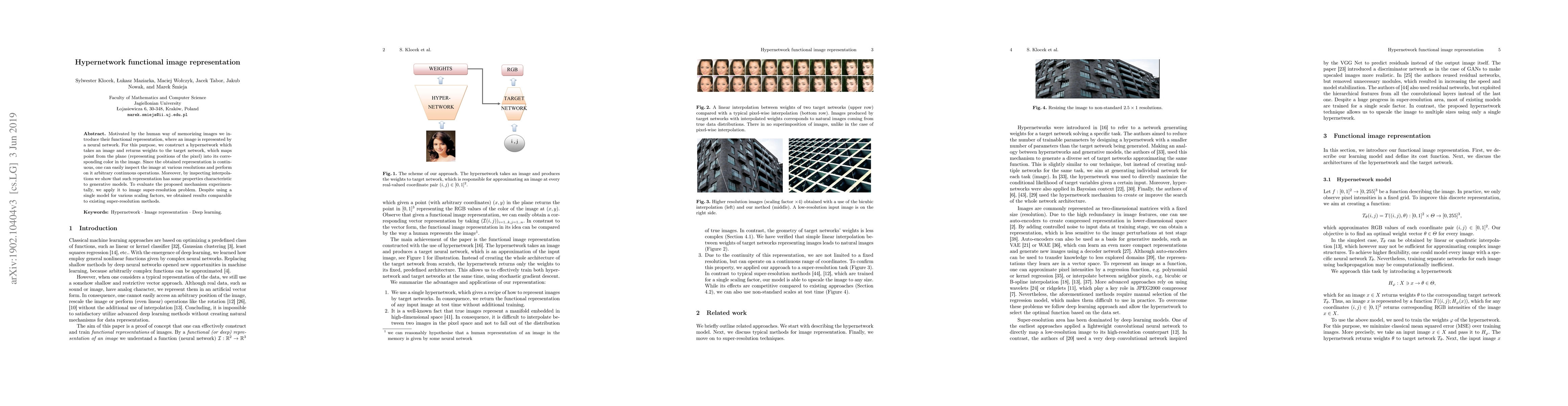 Motivated by the human way of memorizing images we introduce their functional representation, where an image is represented by a neural network. For this purpose, we construct a hypernetwork which takes an image and returns weights to the target network, which maps point from the plane (representing positions of the pixel) into its corresponding color in the image. Since the obtained representation is continuous, one can easily inspect the image at various resolutions and perform on it arbitrary continuous operations. Moreover, by inspecting interpolations we show that such representation has some properties characteristic to generative models. To evaluate the proposed mechanism experimentally, we apply it to image super-resolution problem. Despite using a single model for various scaling factors, we obtained results comparable to existing super-resolution methods.