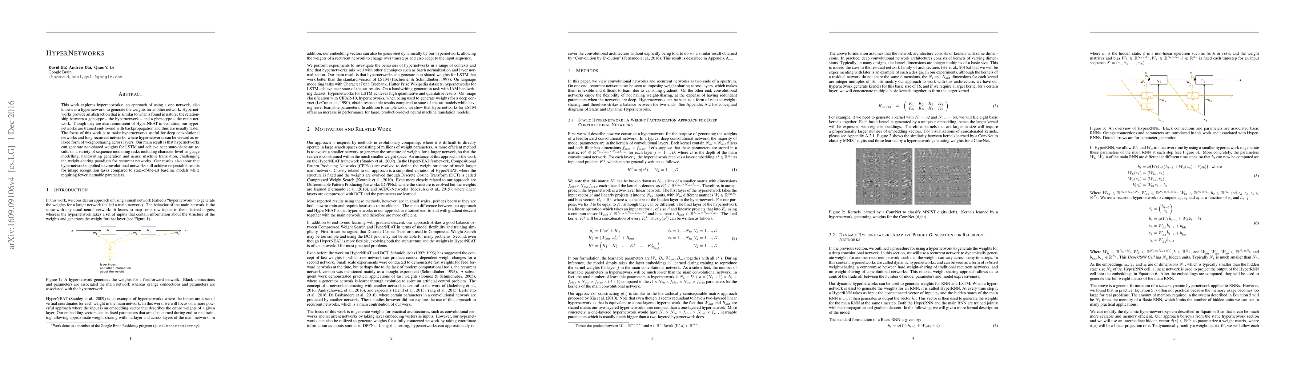 This paper investigates hypernetworks, which use a single network to generate weights for another, achieving near state-of-the-art results in sequence modeling and image recognition tasks while requiring fewer parameters than traditional models. Hypernetworks challenge the weight-sharing paradigm in recurrent networks and demonstrate effectiveness in deep convolutional networks.