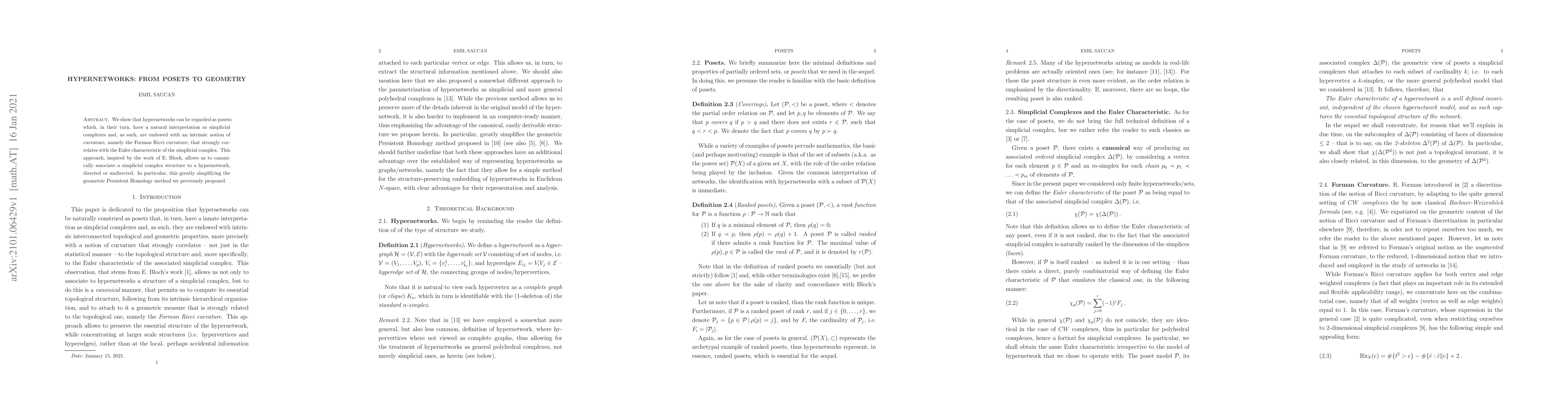 We show that hypernetworks can be regarded as posets which, in their turn, have a natural interpretation as simplicial complexes and, as such, are endowed with an intrinsic notion of curvature, namely the Forman Ricci curvature, that strongly correlates with the Euler characteristic of the simplicial complex. This approach, inspired by the work of E. Bloch, allows us to canonically associate a simplicial complex structure to a hypernetwork, directed or undirected. In particular, this greatly simplifying the geometric Persistent Homology method we previously proposed.