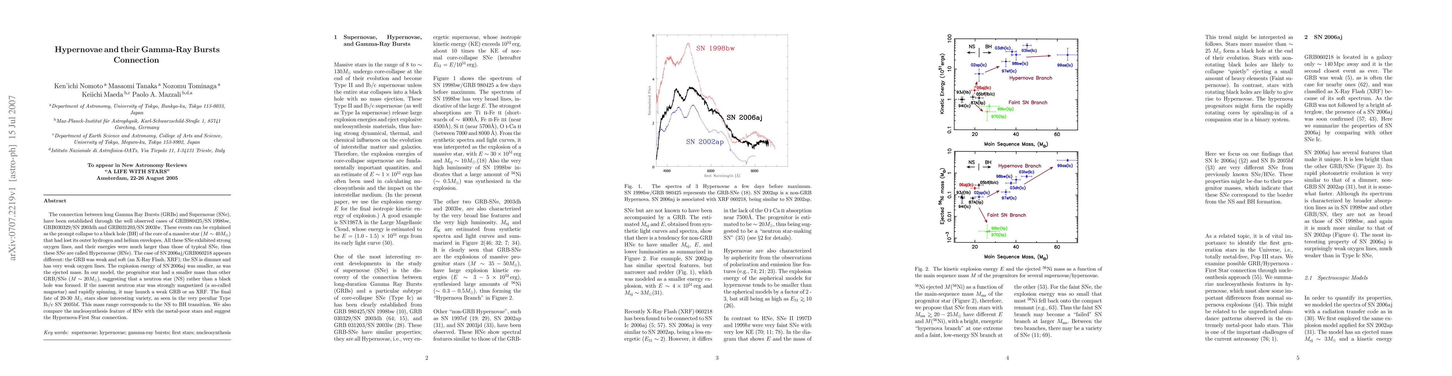 This paper explores the connection between long Gamma-Ray Bursts (GRBs) and Hypernovae, explaining them as core collapses of massive stars leading to black hole formation, except for some cases where a neutron star forms. It highlights the peculiar nature of SN 2006aj/GRB060218, suggesting a magnetar origin for its weak GRB, and discusses the nucleosynthesis implications linking Hypernovae to metal-poor stars.
