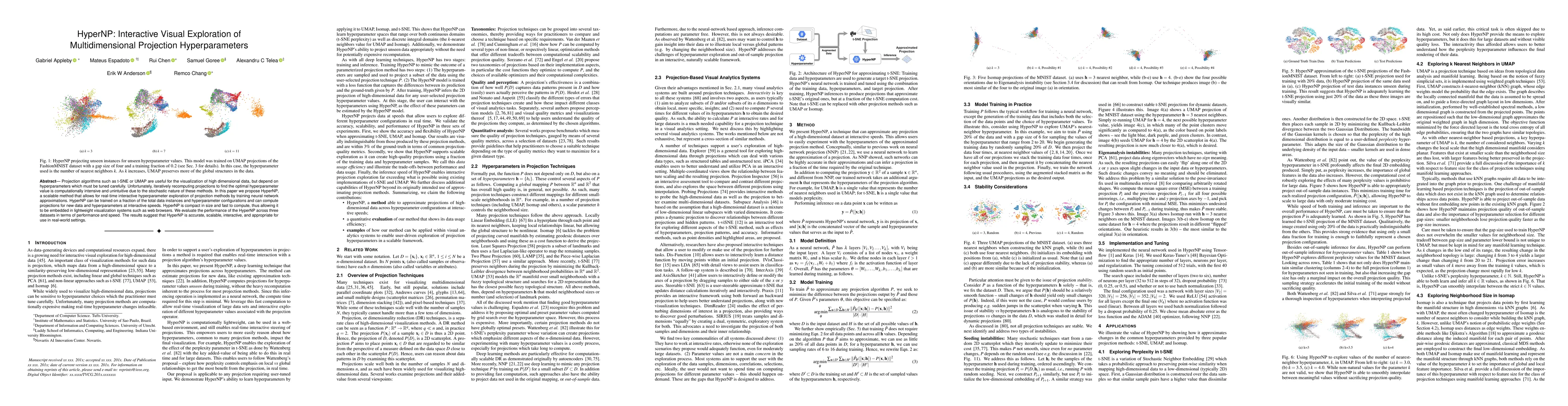 HyperNP proposes a scalable, real-time method for interactive hyperparameter exploration of multidimensional projection algorithms, using neural network approximations trained on a subset of data. It demonstrates accuracy, speed, and scalability across multiple datasets, making it suitable for real-world applications.