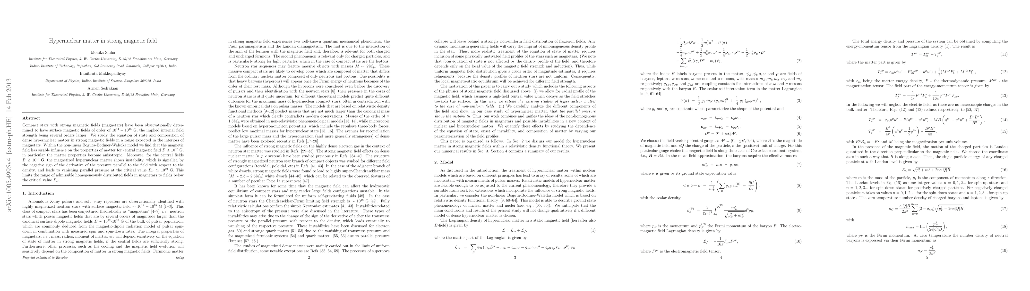 This paper investigates the equation of state and composition of dense hypernuclear matter under strong magnetic fields, finding significant anisotropy and instability at central fields above 10^17 G, with a critical limit at B_cr ≈ 10^19 G for homogeneous fields in magnetars.