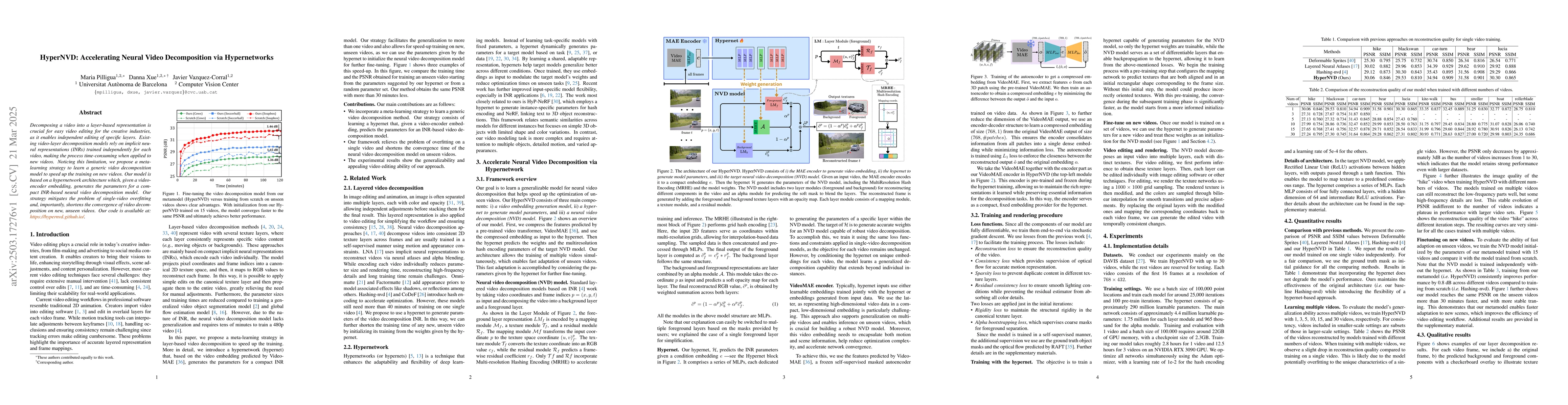 This paper proposes HyperNVD, a hypernetwork-based approach to accelerate neural video decomposition. It introduces a meta-learning strategy to create a generic model that quickly adapts to new videos, significantly reducing training time compared to existing methods.