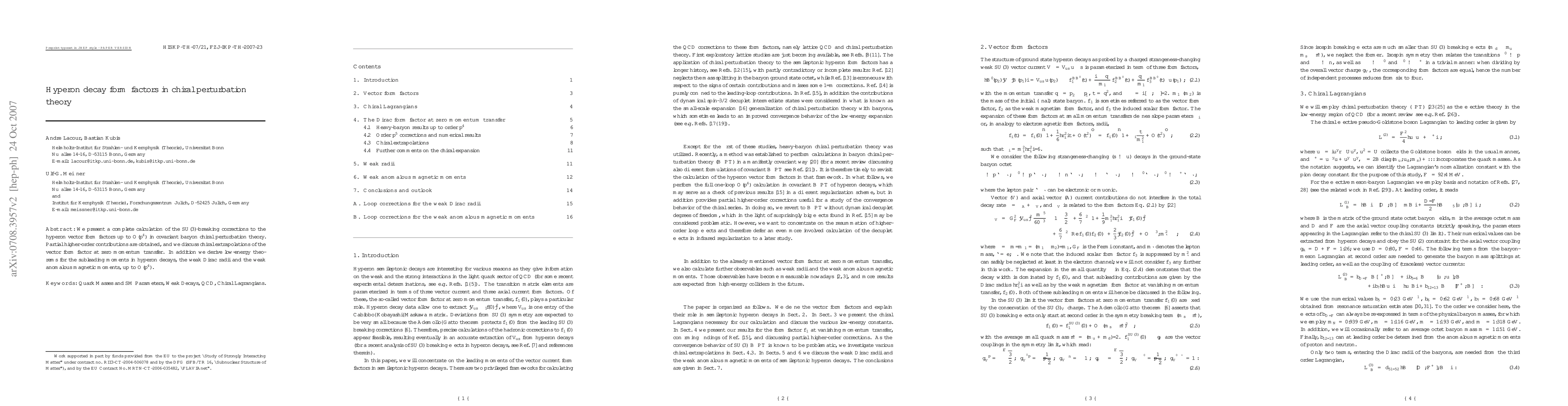 This paper calculates SU(3)-breaking corrections to hyperon vector form factors in covariant baryon chiral perturbation theory up to O(p^4), discusses chiral extrapolations, and derives low-energy theorems for hyperon decay properties including weak Dirac radii and anomalous magnetic moments.
