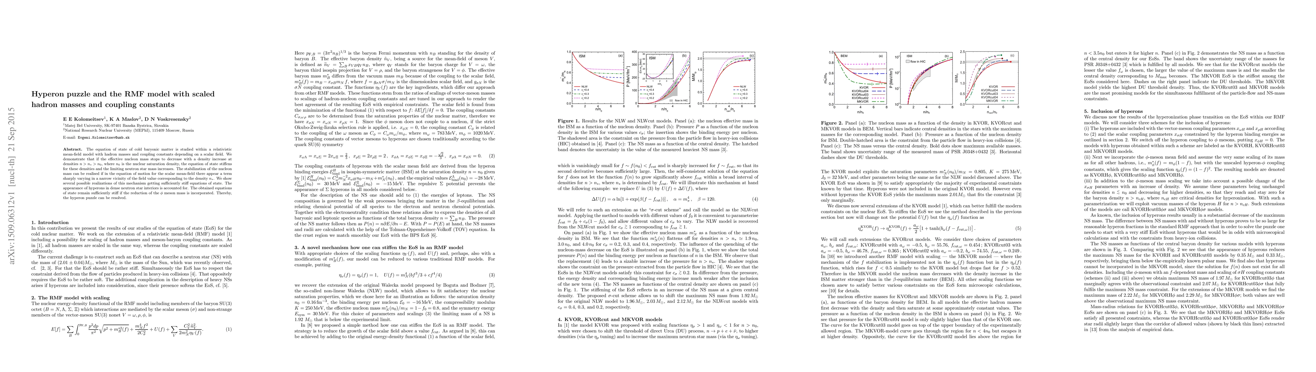 This paper investigates the equation of state for cold baryonic matter using a relativistic mean-field model where hadron masses and coupling constants are density-dependent. The study finds that stabilizing the effective nucleon mass at high densities can lead to a stiffer equation of state, resolving the hyperon puzzle by incorporating hyperon appearance and reduced meson mass.