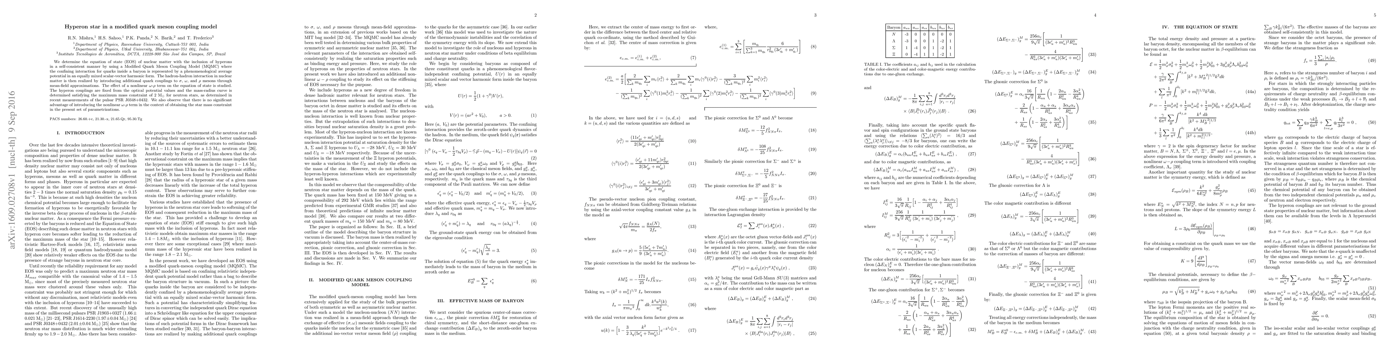 We determine the equation of state (EOS) of nuclear matter with the inclusion of hyperons in a self-consistent manner by using a Modified Quark Meson Coupling Model (MQMC) where the confining interaction for quarks inside a baryon is represented by a phenomenological average potential in an equally mixed scalar-vector harmonic form. The hadron-hadron interaction in nuclear matter is then realized by introducing additional quark couplings to $\sigma$, $\omega$, and $\rho$ mesons through mean-field approximations. The effect of a nonlinear $\omega$-$\rho$ term on the equation of state is studied. The hyperon couplings are fixed from the optical potential values and the mass-radius curve is determined satisfying the maximum mass constraint of $2$~M$_{\odot}$ for neutron stars, as determined in recent measurements of the pulsar PSR J0348+0432. We also observe that there is no significant advantage of introducing the nonlinear $\omega$-$\rho$ term in the context of obtaining the star mass constraint in the present set of parametrizations.