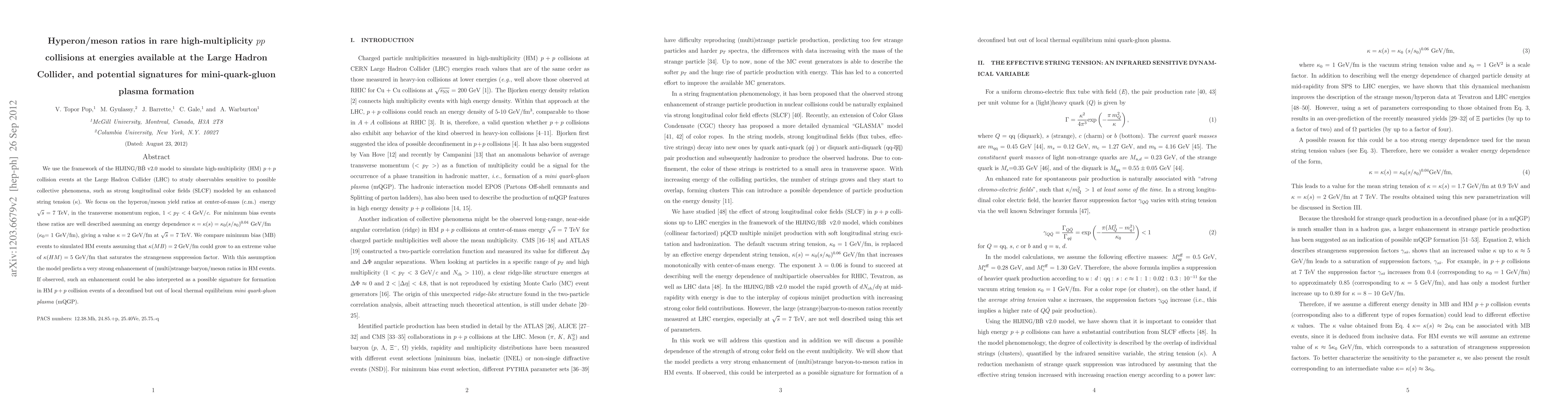 We use the framework of the HIJING/B\=B v2.0 model to simulate high-multiplicity (HM) $p+p$ collision events at the Large Hadron Collider (LHC) to study observables sensitive to possible collective phenomena, such as strong longitudinal color fields (SLCF) modeled by an enhanced string tension ($\kappa$). We focus on the hyperon/meson yield ratios at center-of-mass (c.m.) energy $\sqrt{s}$ = 7 TeV, in the transverse momentum region, $1 < p_T < 4 $ GeV/{\it c}. For minimum bias events these ratios are well described assuming an energy dependence $\kappa = \kappa(s)= \kappa_{0} (s/s_{0})^{0.04} {\rm GeV/fm}$ ($\kappa_{0}$= 1 GeV/fm), giving a value $\kappa = 2$ GeV/fm at $\sqrt{s}$ = 7 TeV. We compare minimum bias (MB) events to simulated HM events assuming that $\kappa(MB)=2$ GeV/fm could grow to an extreme value of $\kappa(HM)=5$ GeV/fm that saturates the strangeness suppression factor. With this assumption the model predicts a very strong enhancement of (multi)strange baryon/meson ratios in HM events. If observed, such an enhancement could be also interpreted as a possible signature for formation in HM $p+p$ collision events of a deconfined but out of local thermal equilibrium {\em mini quark-gluon plasma} (mQGP).