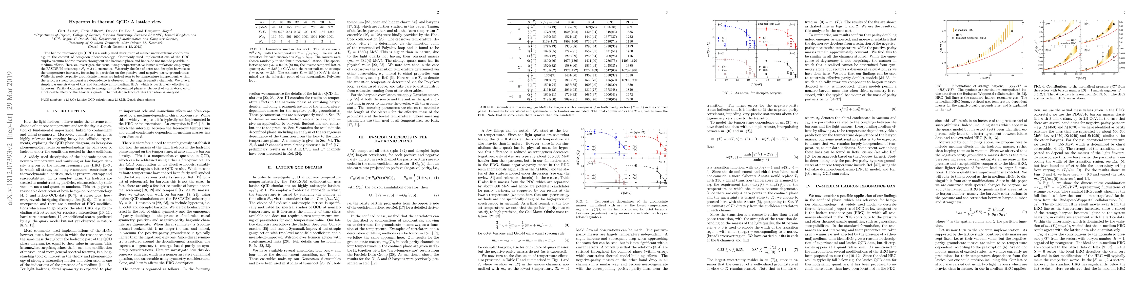 The hadron resonance gas (HRG) is a widely used description of matter under extreme conditions, e.g. in the context of heavy-ion phenomenology. Commonly used implementations of the HRG employ vacuum hadron masses throughout the hadronic phase and hence do not include possible in-medium effects. Here we investigate this issue, using nonperturbative lattice simulations employing the FASTSUM anisotropic Nf=2+1 ensembles. We study the fate of octet and decuplet baryons as the temperature increases, focussing in particular on the positive- and negative-parity groundstates. While the positive-parity groundstate masses are indeed seen to be temperature independent, within the error, a strong temperature dependence is observed in the negative-parity channels. We give a simple parametrisation of this and formulate an in-medium HRG, which is particularly effective for hyperons. Parity doubling is seen to emerge in the deconfined phase at the level of correlators, with a noticeable effect of the heavier s quark. Channel dependence of this transition is analysed.