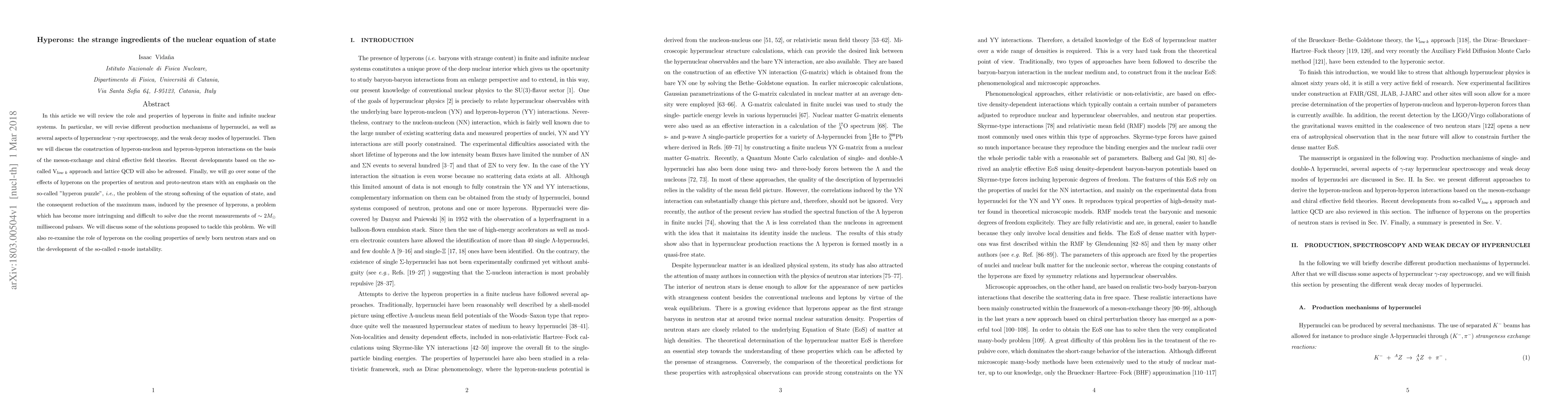 This paper reviews the role of hyperons in nuclear systems, discussing their production mechanisms, interactions, and effects on neutron star properties, particularly addressing the 'hyperon puzzle' that affects neutron star mass limits.