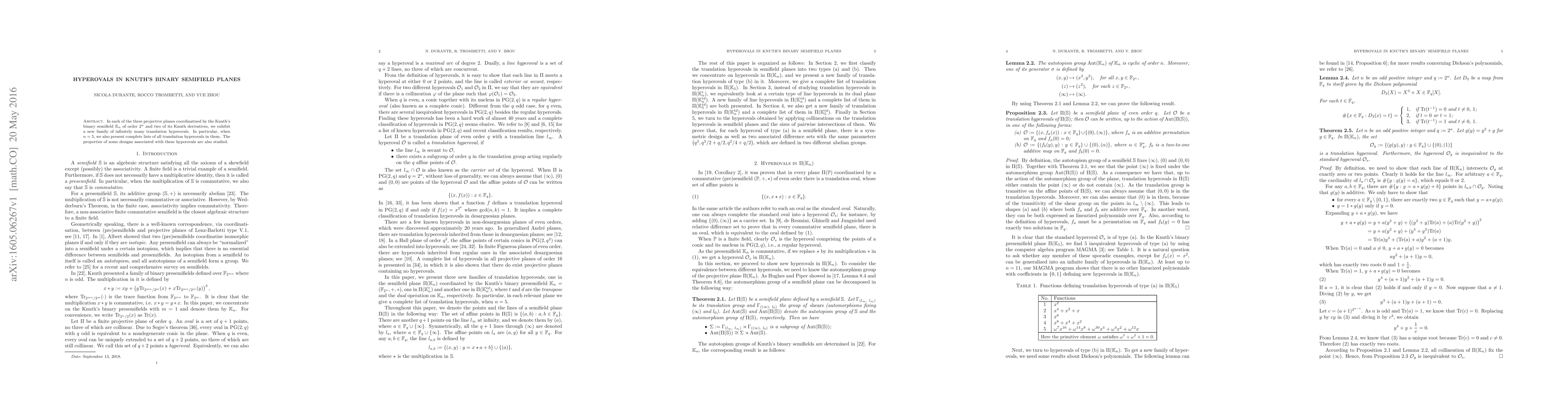 This research identifies and lists translation hyperovals in Knuth's binary semifield planes of orders 2^5, 2^6, and 2^7, with additional properties of related designs examined.