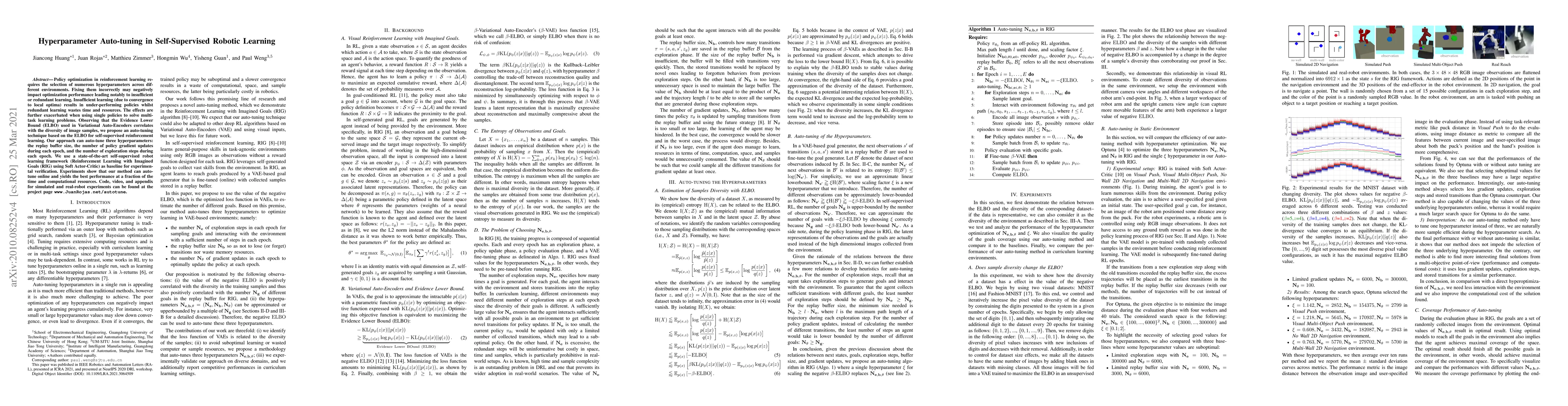 Policy optimization in reinforcement learning requires the selection of numerous hyperparameters across different environments. Fixing them incorrectly may negatively impact optimization performance leading notably to insufficient or redundant learning. Insufficient learning (due to convergence to local optima) results in under-performing policies whilst redundant learning wastes time and resources. The effects are further exacerbated when using single policies to solve multi-task learning problems. Observing that the Evidence Lower Bound (ELBO) used in Variational Auto-Encoders correlates with the diversity of image samples, we propose an auto-tuning technique based on the ELBO for self-supervised reinforcement learning. Our approach can auto-tune three hyperparameters: the replay buffer size, the number of policy gradient updates during each epoch, and the number of exploration steps during each epoch. We use a state-of-the-art self-supervised robot learning framework (Reinforcement Learning with Imagined Goals (RIG) using Soft Actor-Critic) as baseline for experimental verification. Experiments show that our method can auto-tune online and yields the best performance at a fraction of the time and computational resources. Code, video, and appendix for simulated and real-robot experiments can be found at the project page \url{www.JuanRojas.net/autotune}.