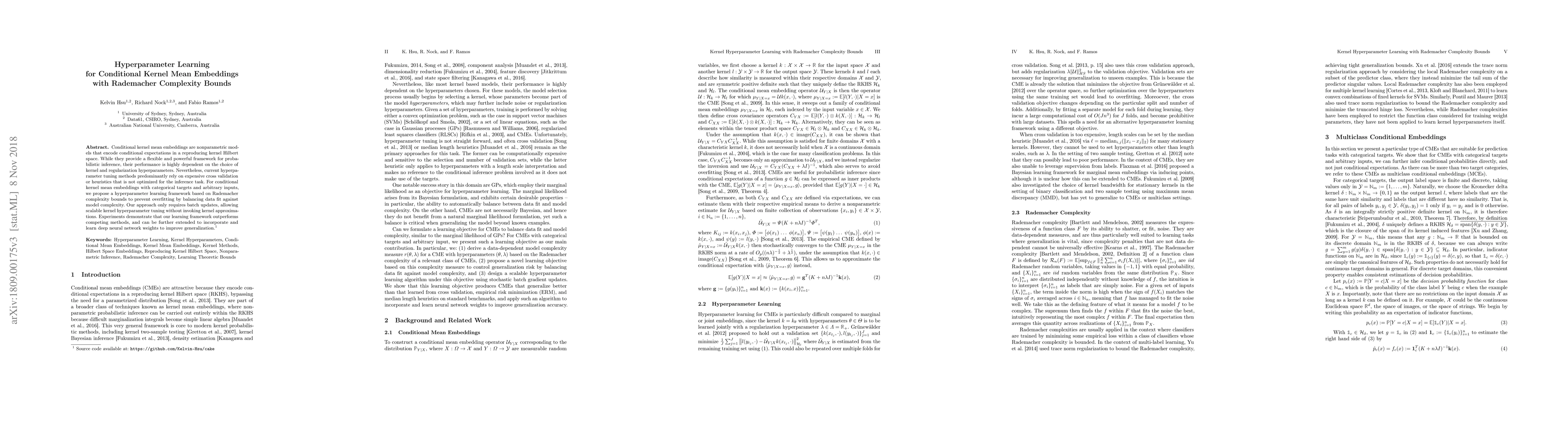 This paper introduces a novel hyperparameter learning framework for conditional kernel mean embeddings that leverages Rademacher complexity bounds to balance data fit and model complexity, thus preventing overfitting. The method scales efficiently through batch updates and outperforms existing tuning methods in experiments, with potential for extension to deep neural networks.