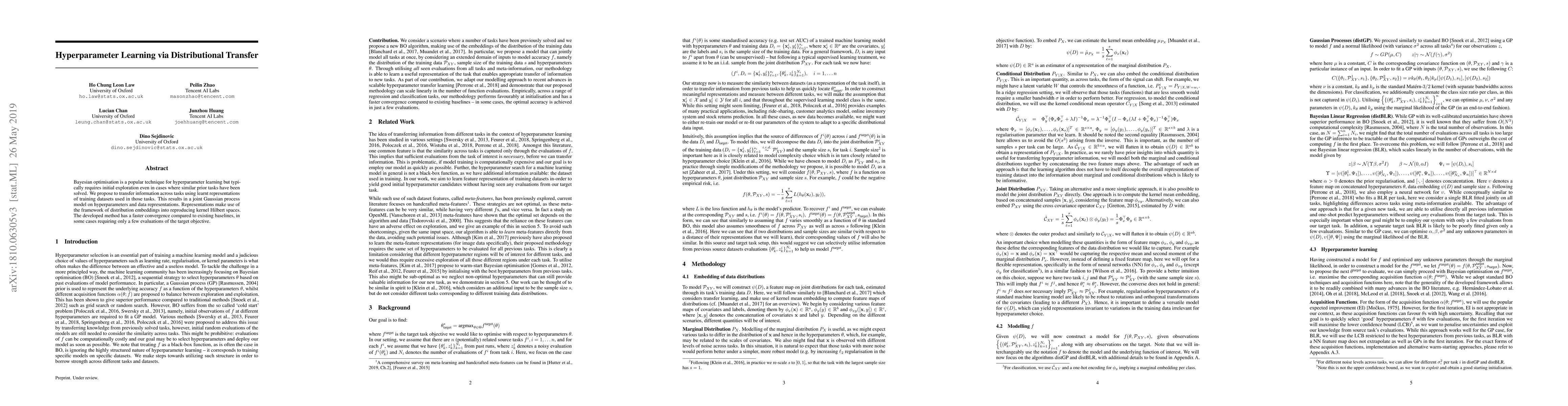 This paper proposes a method for hyperparameter learning using distributional transfer, leveraging learnt representations of training datasets to accelerate convergence. The approach employs a joint Gaussian process model and distribution embeddings, achieving faster optimization compared to traditional Bayesian optimisation.