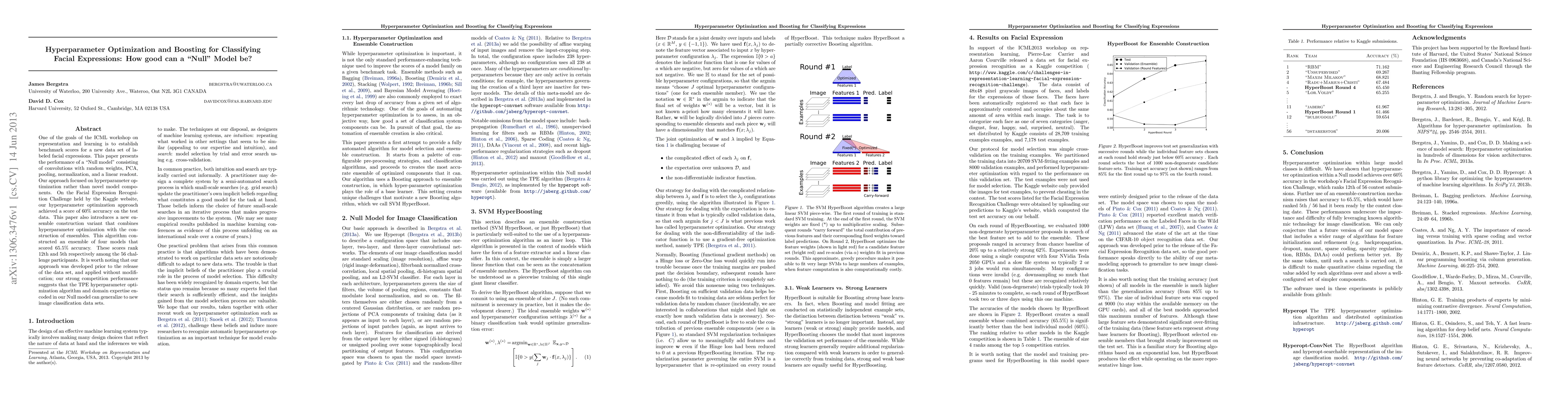 One of the goals of the ICML workshop on representation and learning is to establish benchmark scores for a new data set of labeled facial expressions. This paper presents the performance of a "Null" model consisting of convolutions with random weights, PCA, pooling, normalization, and a linear readout. Our approach focused on hyperparameter optimization rather than novel model components. On the Facial Expression Recognition Challenge held by the Kaggle website, our hyperparameter optimization approach achieved a score of 60% accuracy on the test data. This paper also introduces a new ensemble construction variant that combines hyperparameter optimization with the construction of ensembles. This algorithm constructed an ensemble of four models that scored 65.5% accuracy. These scores rank 12th and 5th respectively among the 56 challenge participants. It is worth noting that our approach was developed prior to the release of the data set, and applied without modification; our strong competition performance suggests that the TPE hyperparameter optimization algorithm and domain expertise encoded in our Null model can generalize to new image classification data sets.