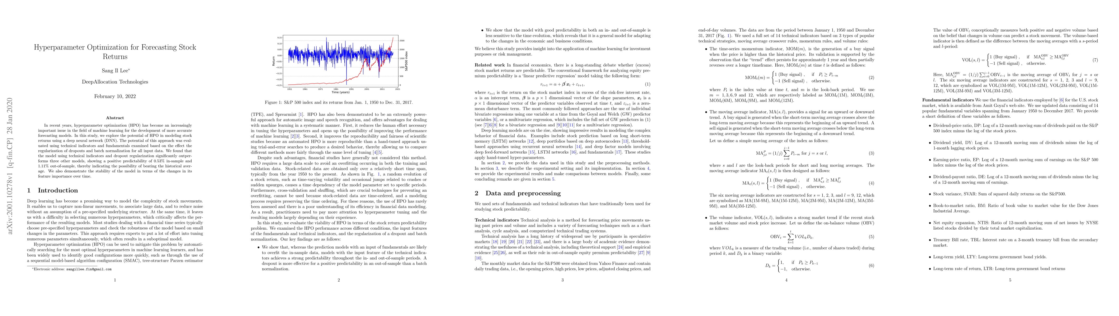 In recent years, hyperparameter optimization (HPO) has become an increasingly important issue in the field of machine learning for the development of more accurate forecasting models. In this study, we explore the potential of HPO in modeling stock returns using a deep neural network (DNN). The potential of this approach was evaluated using technical indicators and fundamentals examined based on the effect the regularization of dropouts and batch normalization for all input data. We found that the model using technical indicators and dropout regularization significantly outperforms three other models, showing a positive predictability of 0.53% in-sample and 1.11% out-of-sample, thereby indicating the possibility of beating the historical average. We also demonstrate the stability of the model in terms of the changes in its feature importance over time.