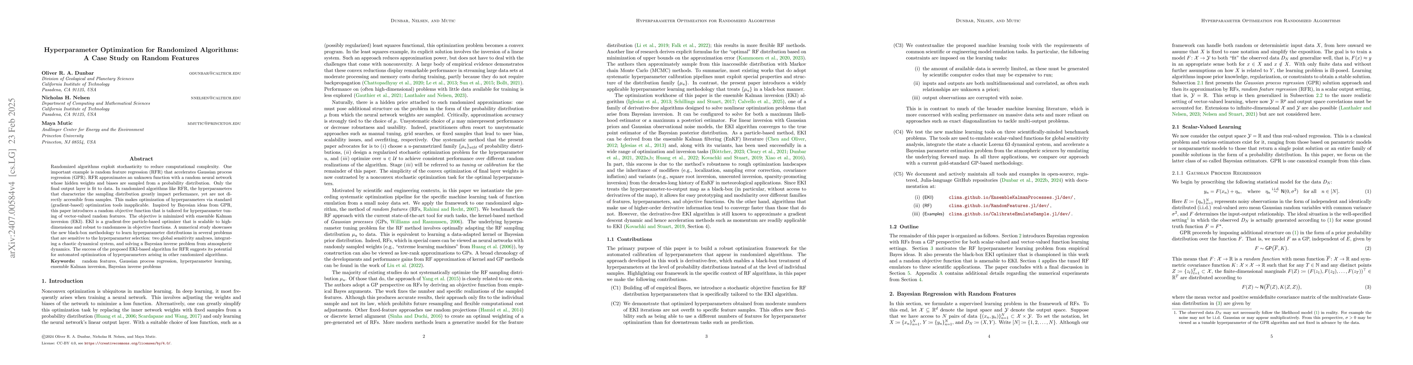 This paper develops a novel gradient-free optimization method, ensemble Kalman inversion (EKI), for tuning hyperparameters in random feature regression, demonstrating its efficacy through several sensitive applications like global sensitivity analysis and chaotic system integration. The proposed approach shows promise for optimizing hyperparameters in other randomized algorithms.