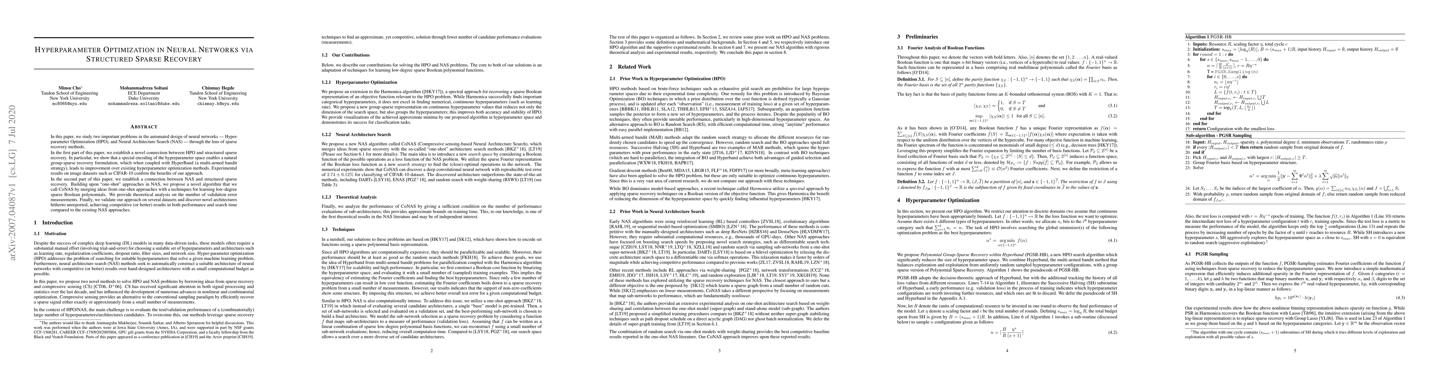 In this paper, we study two important problems in the automated design of neural networks -- Hyper-parameter Optimization (HPO), and Neural Architecture Search (NAS) -- through the lens of sparse recovery methods. In the first part of this paper, we establish a novel connection between HPO and structured sparse recovery. In particular, we show that a special encoding of the hyperparameter space enables a natural group-sparse recovery formulation, which when coupled with HyperBand (a multi-armed bandit strategy), leads to improvement over existing hyperparameter optimization methods. Experimental results on image datasets such as CIFAR-10 confirm the benefits of our approach. In the second part of this paper, we establish a connection between NAS and structured sparse recovery. Building upon ``one-shot'' approaches in NAS, we propose a novel algorithm that we call CoNAS by merging ideas from one-shot approaches with a techniques for learning low-degree sparse Boolean polynomials. We provide theoretical analysis on the number of validation error measurements. Finally, we validate our approach on several datasets and discover novel architectures hitherto unreported, achieving competitive (or better) results in both performance and search time compared to the existing NAS approaches.