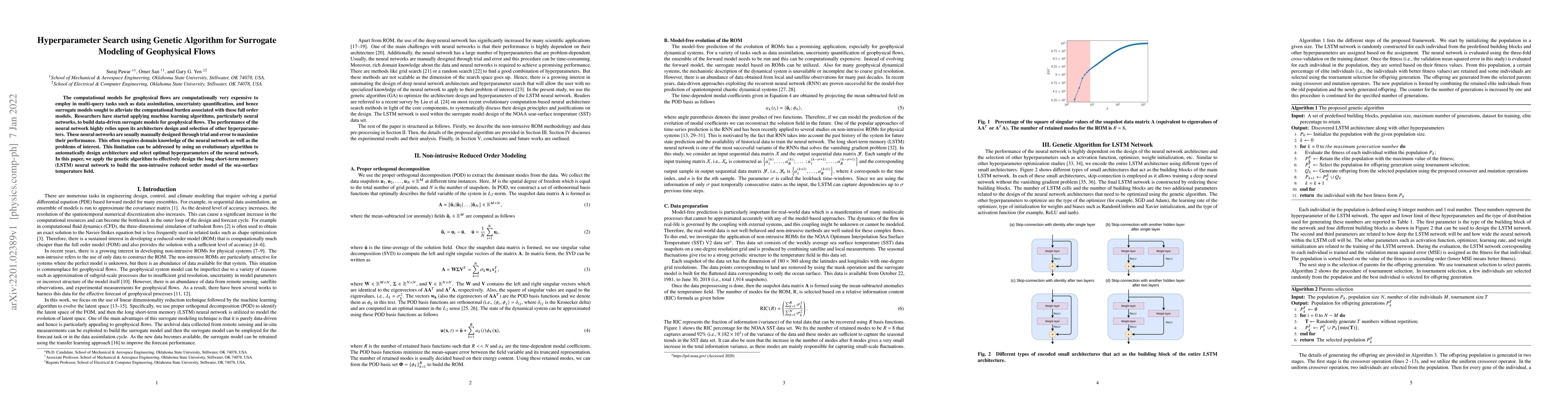 The computational models for geophysical flows are computationally very expensive to employ in multi-query tasks such as data assimilation, uncertainty quantification, and hence surrogate models sought to alleviate the computational burden associated with these full order models. Researchers have started applying machine learning algorithms, particularly neural networks, to build data-driven surrogate models for geophysical flows. The performance of the neural network highly relies upon its architecture design and selection of other hyperparameters. These neural networks are usually manually designed through trial and error to maximize their performance. This often requires domain knowledge of the neural network as well as the problems of interest. This limitation can be addressed by using an evolutionary algorithm to automatically design architecture and select optimal hyperparameters of the neural network. In this paper, we apply the genetic algorithm to effectively design the long short-term memory (LSTM) neural network to build the non-intrusive reduced order model of the sea-surface temperature field.