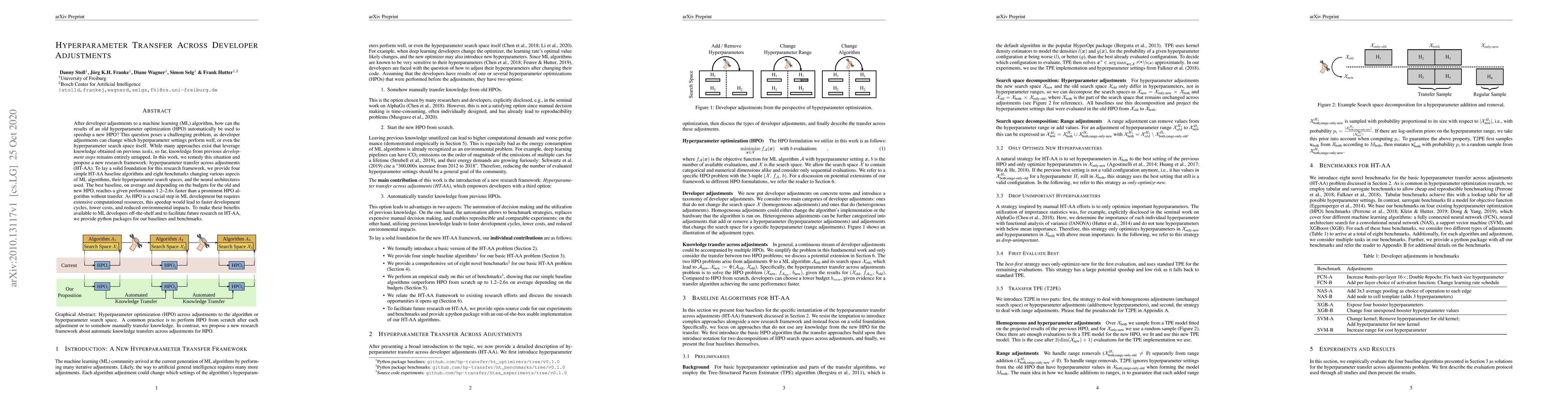 This paper introduces a framework for hyperparameter transfer across developer adjustments (HT-AA) to speed up new hyperparameter optimization (HPO) processes by leveraging knowledge from previous development steps. The proposed framework includes four baseline algorithms and eight benchmarks, demonstrating a 1.2--2.6x faster performance improvement compared to a prominent HPO algorithm without transfer, thus reducing development time and costs.