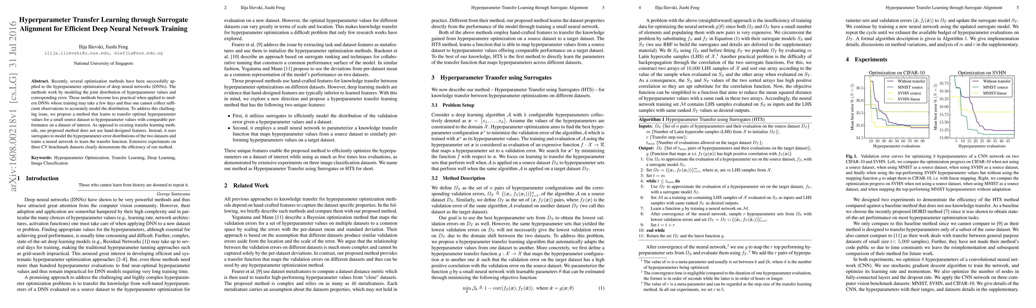 This paper proposes a method for hyperparameter transfer learning using surrogate alignment to efficiently train deep neural networks. It employs neural networks to model and transfer optimal hyperparameters from a source dataset to a target dataset without relying on hand-designed features, demonstrating improved efficiency through experiments on benchmark datasets.