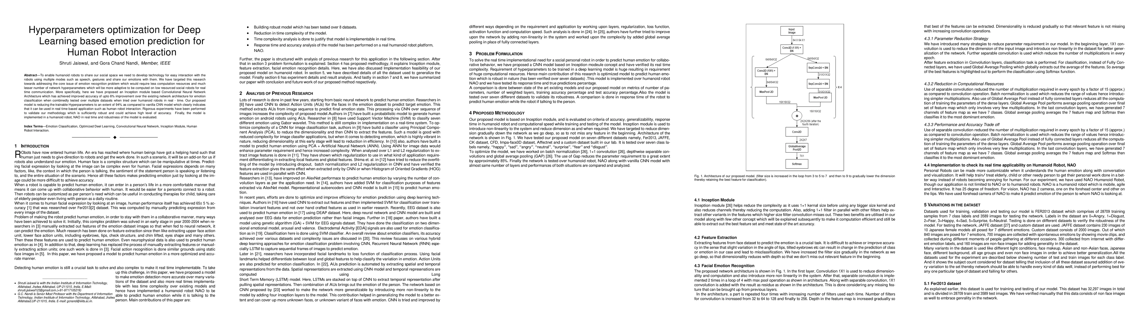 This paper proposes an Inception module-based Convolutional Neural Network for emotion prediction in human-robot interaction, achieving a 6% accuracy improvement and reducing trainable hyperparameters by 94% compared to traditional CNNs, making it suitable for low-resource robots. The model was rigorously tested and implemented on a NAO robot, demonstrating its robustness and real-time applicability.