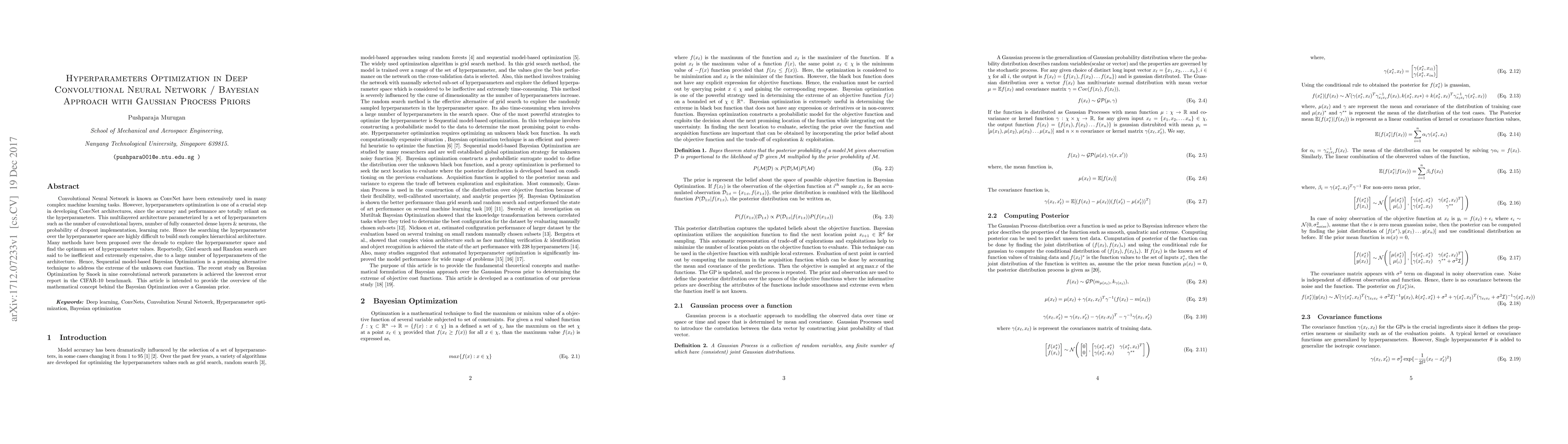 Convolutional Neural Network is known as ConvNet have been extensively used in many complex machine learning tasks. However, hyperparameters optimization is one of a crucial step in developing ConvNet architectures, since the accuracy and performance are reliant on the hyperparameters. This multilayered architecture parameterized by a set of hyperparameters such as the number of convolutional layers, number of fully connected dense layers & neurons, the probability of dropout implementation, learning rate. Hence the searching the hyperparameter over the hyperparameter space are highly difficult to build such complex hierarchical architecture. Many methods have been proposed over the decade to explore the hyperparameter space and find the optimum set of hyperparameter values. Reportedly, Gird search and Random search are said to be inefficient and extremely expensive, due to a large number of hyperparameters of the architecture. Hence, Sequential model-based Bayesian Optimization is a promising alternative technique to address the extreme of the unknown cost function. The recent study on Bayesian Optimization by Snoek in nine convolutional network parameters is achieved the lowerest error report in the CIFAR-10 benchmark. This article is intended to provide the overview of the mathematical concept behind the Bayesian Optimization over a Gaussian prior.