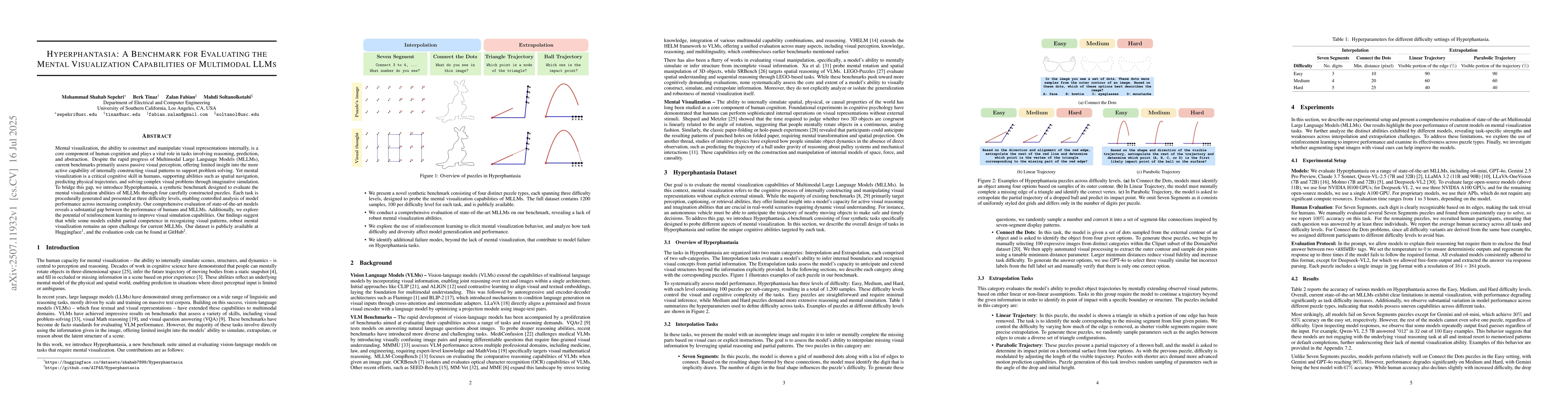 The paper introduces Hyperphantasia, a benchmark to assess mental visualization skills in Multimodal Large Language Models (MLLMs). Evaluation through four puzzles reveals a significant performance gap between humans and current MLLMs, highlighting mental visualization as a challenging area for improvement in AI models.