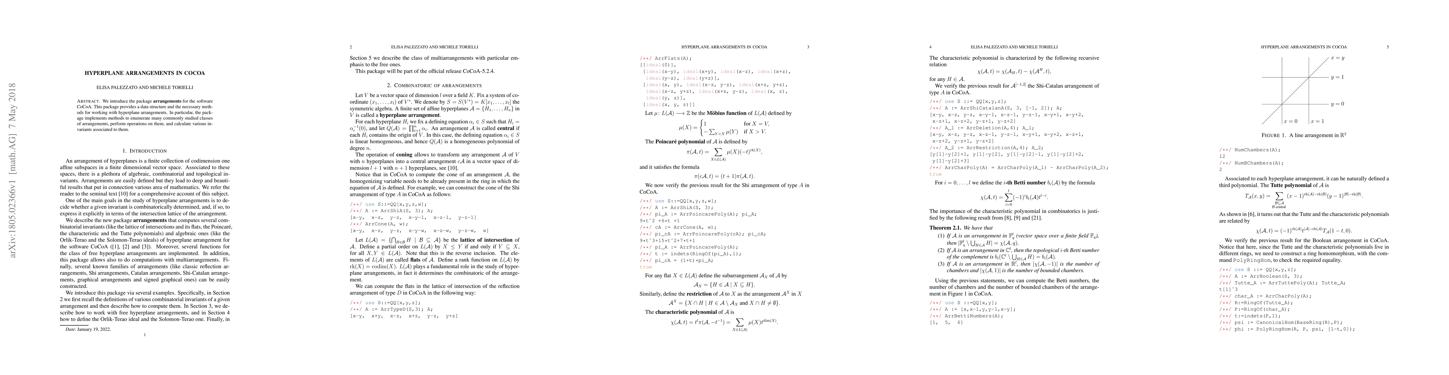 Summary: The CoCoA software now includes a new package, arrangements, for managing hyperplane arrangements, providing methods for enumeration, operations, and computation of associated invariants. This facilitates in-depth study of hyperplane arrangements within the CoCoA environment.