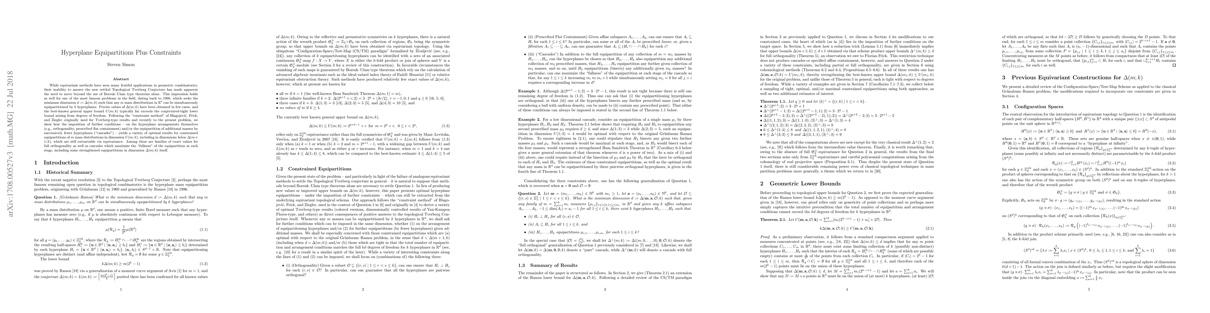 This paper proposes a "constraint method" to improve upon equivariant methods for solving the minimum dimension problem for equipartitions by hyperplanes, achieving optimal results in dimensions below previously known bounds. It introduces additional conditions like orthogonality and cascades to derive exact values for constrained equipartitions.