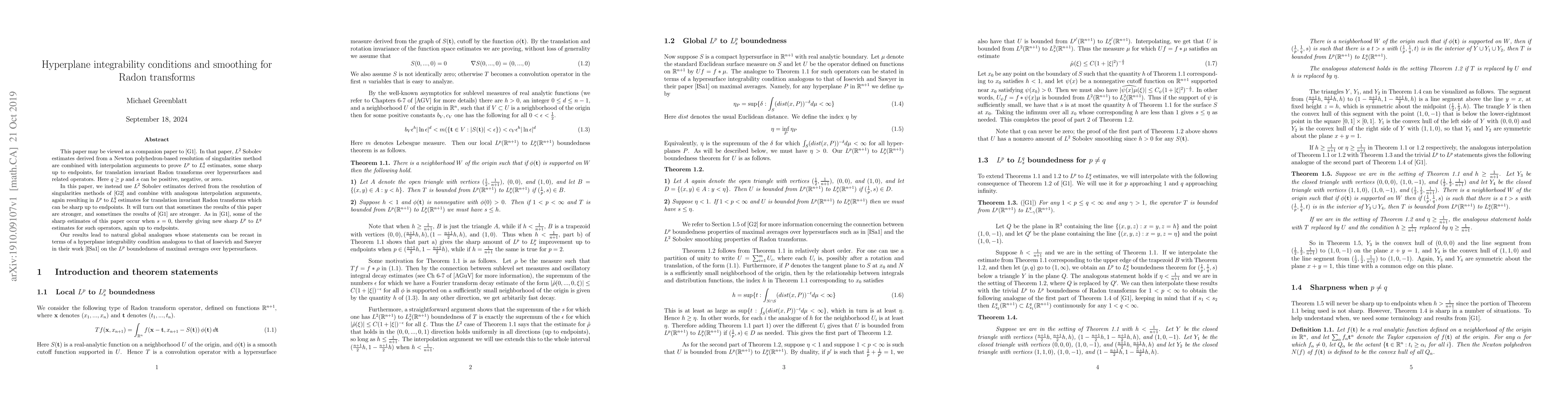 This paper may be viewed as a companion paper to [G1]. In that paper, $L^2$ Sobolev estimates derived from a Newton polyhedron-based resolution of singularities method are combined with interpolation arguments to prove $L^p$ to $L^q_s$ estimates, some sharp up to endpoints, for translation invariant Radon transforms over hypersurfaces and related operators. Here $q \geq p$ and $s$ can be positive, negative, or zero. In this paper, we instead use $L^2$ Sobolev estimates derived from the resolution of singularities methods of [G2] and combine with analogous interpolation arguments, again resulting in $L^p$ to $L^q_s$ estimates for translation invariant Radon transforms which can be sharp up to endpoints. It will turn out that sometimes the results of this paper are stronger, and sometimes the results of [G1] are stronger. As in [G1], some of the sharp estimates of this paper occur when $s = 0$, thereby giving new sharp $L^p$ to $L^q$ estimates for such operators, again up to endpoints. Our results lead to natural global analogues whose statements can be recast in terms of a hyperplane integrability condition analogous to that of Iosevich and Sawyer in their work [ISa1] on the $L^p$ boundedness of maximal averages over hypersurfaces.