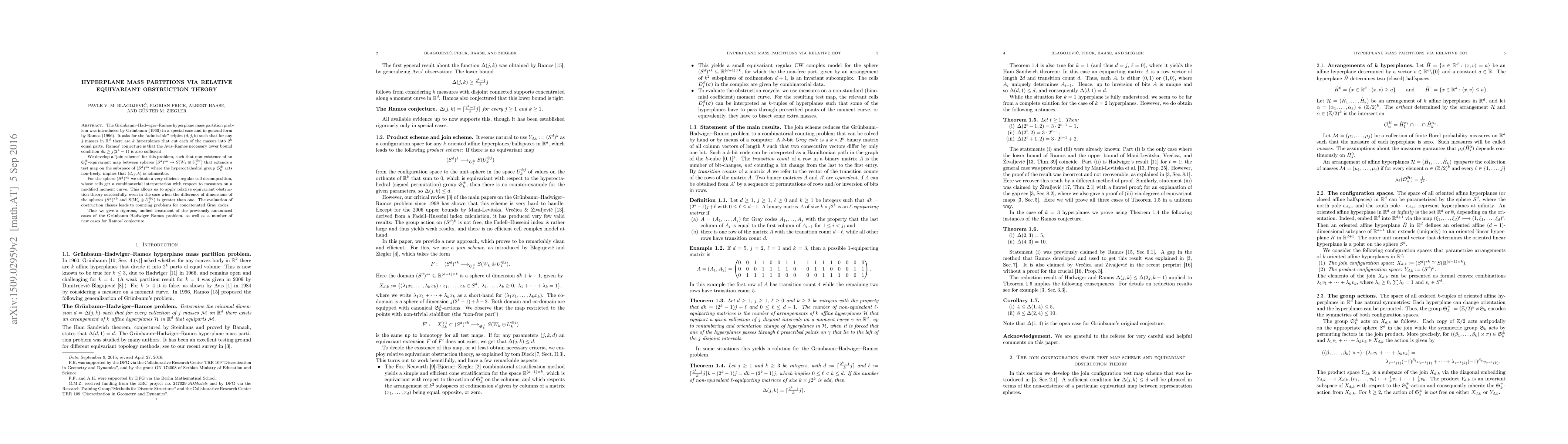 The Gr\"unbaum-Hadwiger-Ramos hyperplane mass partition problem was introduced by Gr\"unbaum (1960) in a special case and in general form by Ramos (1996). It asks for the "admissible" triples $(d,j,k)$ such that for any $j$ masses in $\mathbb{R}^d$ there are $k$ hyperplanes that cut each of the masses into $2^k$ equal parts. Ramos' conjecture is that the Avis-Ramos necessary lower bound condition $dk\ge j(2^k-1)$ is also sufficient. We develop a "join scheme" for this problem, such that non-existence of an $G_k$-equivariant map between spheres $(S^d)^{*k} \rightarrow S(W_k\oplus U_k^{\oplus j})$ that extends a test map on the subspace of $(S^d)^{*k}$ where the hyperoctahedral group $G_k$ acts non-freely, implies that $(d,j,k)$ is admissible. For the sphere $(S^d)^{*k}$ we obtain a very efficient regular cell decomposition, whose cells get a combinatorial interpretation with respect to measures on a modified moment curve. This allows us to apply relative equivariant obstruction theory successfully, even in the case when the difference of dimensions of the spheres $(S^d)^{*k}$ and $S(W_k\oplus U_k^{\oplus j})$ is greater than one. The evaluation of obstruction classes leads to counting problems for concatenated Gray codes. Thus we give a rigorous, unified treatment of the previously announced cases of the Gr\"unbaum-Hadwiger-Ramos problem, as well as a number of new cases for Ramos' conjecture.