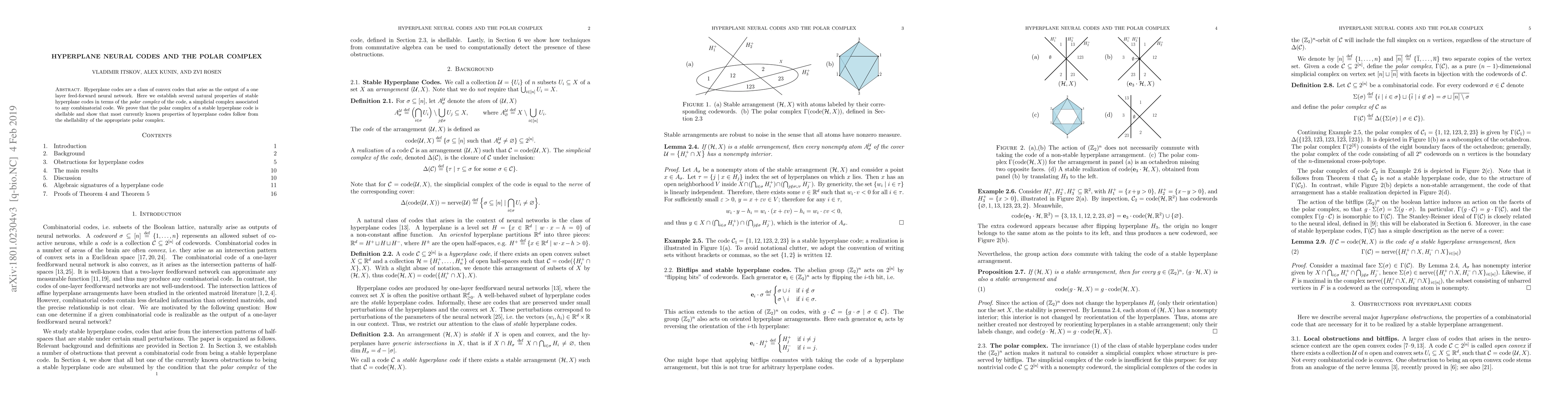 Hyperplane codes are a class of convex codes that arise as the output of a one layer feed-forward neural network. Here we establish several natural properties of stable hyperplane codes in terms of the {\it polar complex} of the code, a simplicial complex associated to any combinatorial code. We prove that the polar complex of a stable hyperplane code is shellable and show that most currently known properties of the hyperplane codes follow from the shellability of the appropriate polar complex.