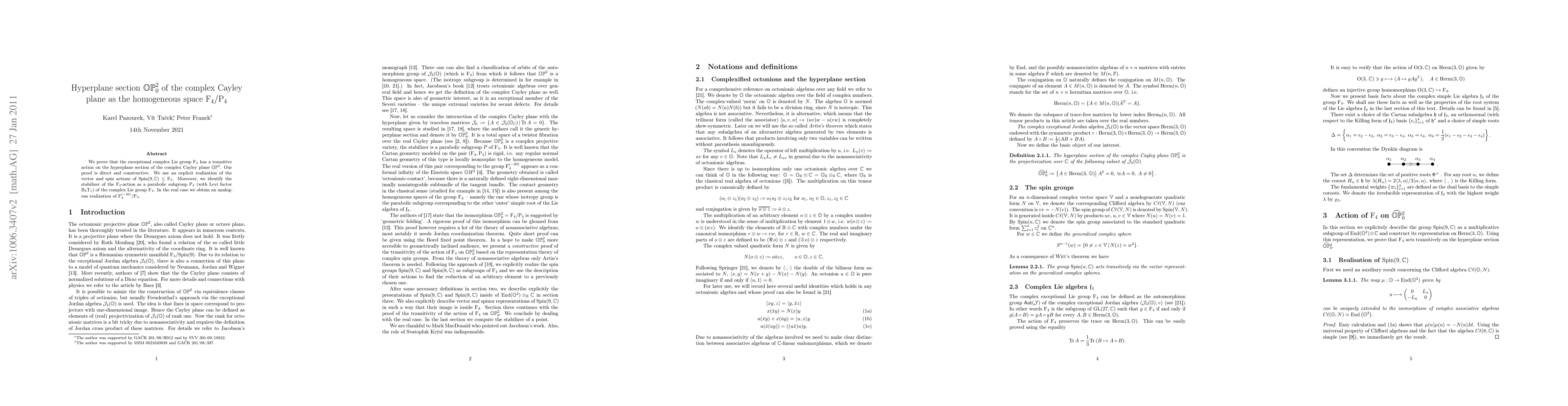 We prove that the exceptional complex Lie group $F_4$ has a transitive action on the hyperplane section of the complex Cayley plane $\mathbb{OP}^2$. Our proof is direct and constructive. We use an explicit realization of the vector and spin actions of $\Spin(9,\C) \leq F_4$. Moreover, we identify the stabilizer of the $F_4$-action as a parabolic subgroup $P_4$ (with Levi factor $B_3T_1$) of the complex Lie group $F_4$. In the real case we obtain an analogous realization of $F_4^{(-20)}/P_4$.