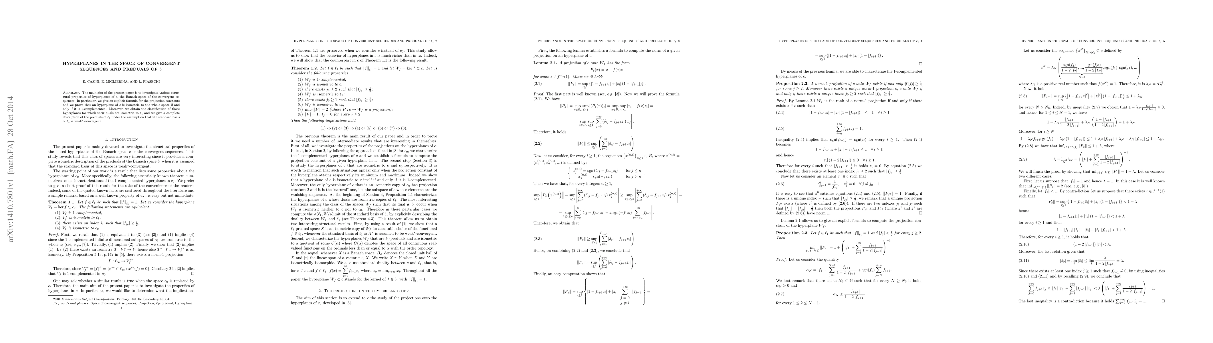 The main aim of the present paper is to investigate various structural properties of hyperplanes of $c$, the Banach space of the convergent sequences. In particular, we give an explicit formula for the projection constants and we prove that an hyperplane of $c$ is isometric to the whole space if and only if it is $1$-complemented. Moreover, we obtain the classification of those hyperplanes for which their duals are isometric to $\ell_{1}$ and we give a complete description of the preduals of $\ell_{1}$ under the assumption that the standard basis of $\ell_{1}$ is weak$^{*}$-convergent.