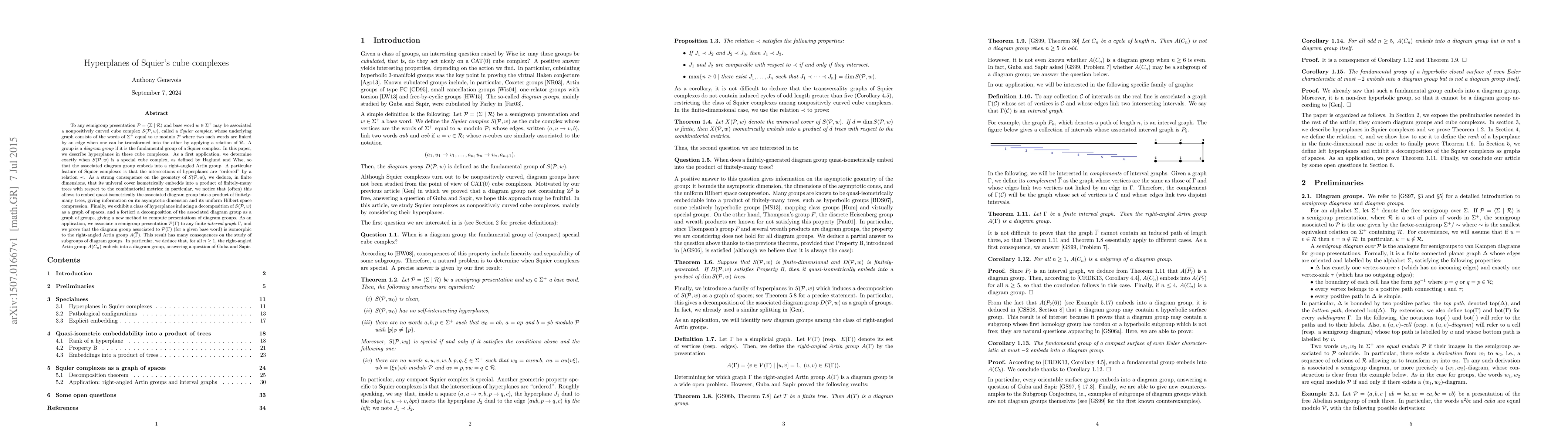 To any semigroup presentation $\mathcal{P}= \langle \Sigma \mid \mathcal{R} \rangle$ and base word $w \in \Sigma^+$ may be associated a nonpositively curved cube complex $S(\mathcal{P},w)$, called a Squier complex, whose underlying graph consists of the words of $\Sigma^+$ equal to $w$ modulo $\mathcal{P}$ where two such words are linked by an edge when one can be transformed into the other by applying a relation of $\mathcal{R}$. A group is a diagram group if it is the fundamental group of a Squier complex. In this paper, we describe hyperplanes in these cube complexes. As a first application, we determine exactly when $S(\mathcal{P},w)$ is a special cube complex, as defined by Haglund and Wise, so that the associated diagram group embeds into a right-angled Artin group. A particular feature of Squier complexes is that the intersections of hyperplanes are "ordered" by a relation $\prec$. As a strong consequence on the geometry of $S(\mathcal{P},w)$, we deduce, in finite dimensions, that its univeral cover isometrically embedds into a product of finitely-many trees with respect to the combinatorial metrics; in particular, we notice that (often) this allows to embed quasi-isometrically the associated diagram group into a product of finitely-many trees. Finally, we exhibit a class of hyperplanes inducing a decomposition of $S(\mathcal{P},w)$ as a graph of spaces, and a fortiori a decomposition of the associated diagram group as a graph of groups, giving a new method to compute presentations of diagram groups. As an application, we associate a semigroup presentation $\mathcal{P}(\Gamma)$ to any finite interval graph $\Gamma$, and we prove that the diagram group associated to $\mathcal{P}(\Gamma)$ (for a given base word) is isomorphic to the right-angled Artin group $A(\overline{\Gamma})$.