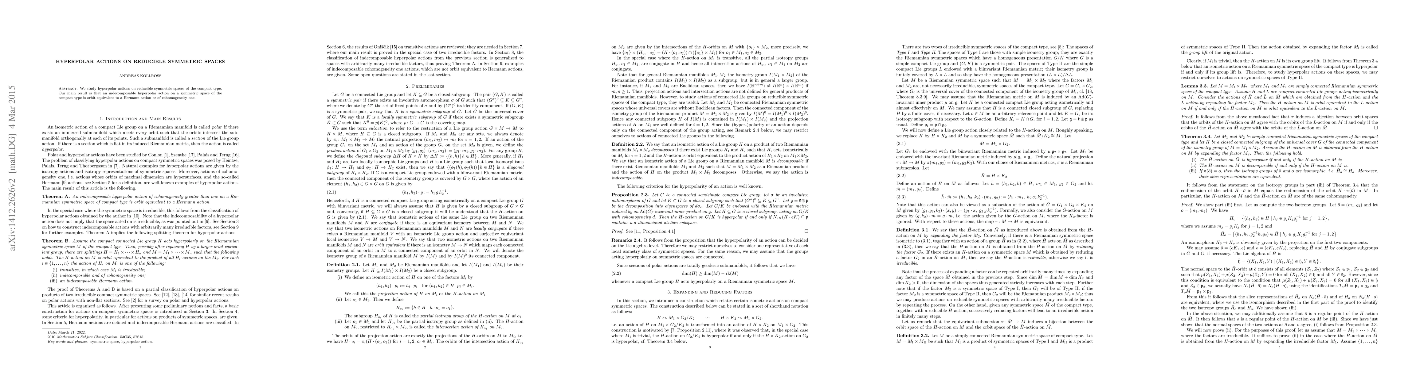 Summary: This paper investigates hyperpolar actions on reducible symmetric spaces of the compact type, proving that an indecomposable hyperpolar action on such spaces is orbit equivalent to either a Hermann action or an action of cohomogeneity one.