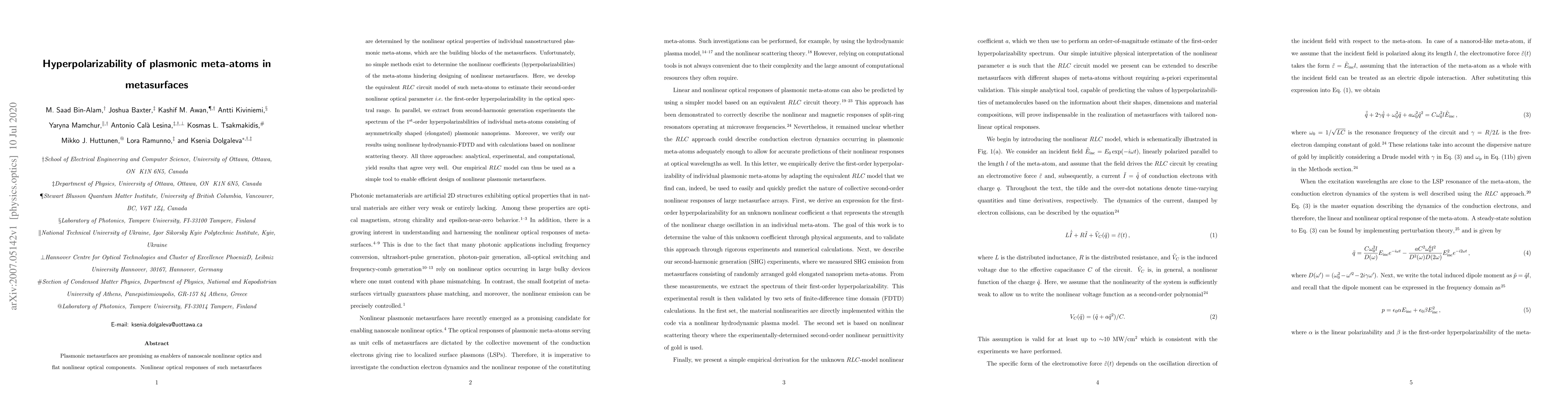 The research develops an equivalent RLC circuit model to estimate the first-order hyperpolarizability (a nonlinear optical parameter) of individual plasmonic meta-atoms in metasurfaces. This model is validated through second-harmonic generation experiments and compared with results from nonlinear hydrodynamic-FDTD simulations and nonlinear scattering theory calculations.