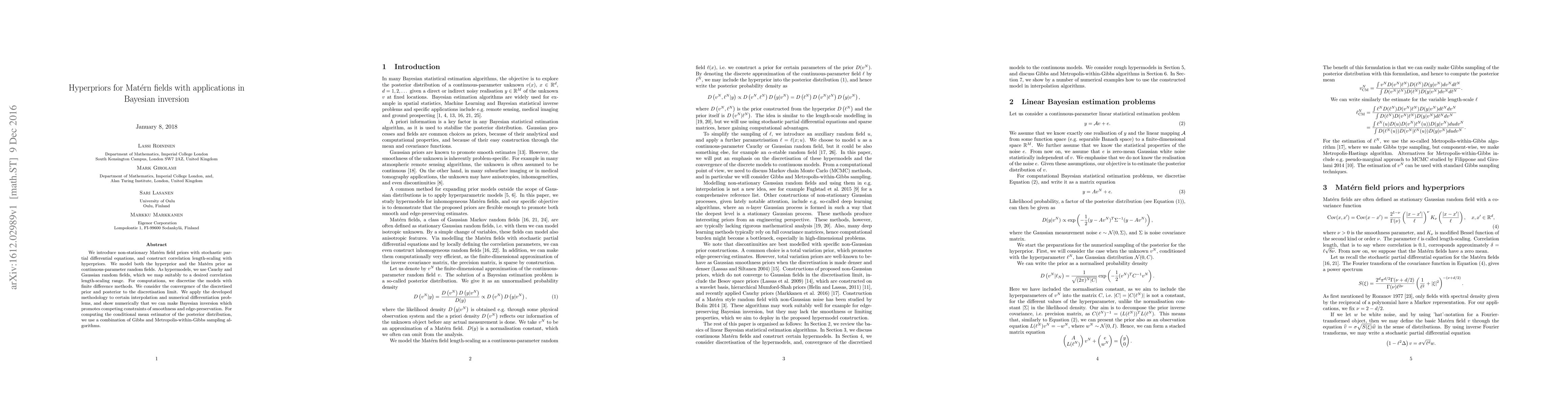 This paper introduces non-stationary Matérn field priors with stochastic partial differential equations, employing hyperpriors for correlation length-scaling. It applies Bayesian inversion to interpolation and numerical differentiation, demonstrating the balance between smoothness and edge-preservation using Gibbs and Metropolis-within-Gibbs sampling.
