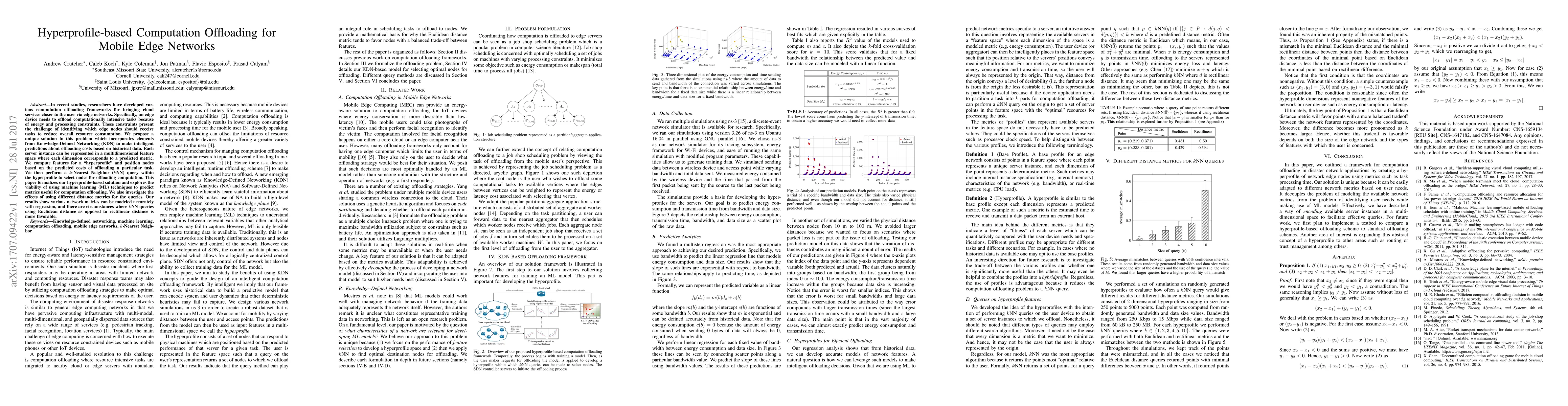In recent studies, researchers have developed various computation offloading frameworks for bringing cloud services closer to the user via edge networks. Specifically, an edge device needs to offload computationally intensive tasks because of energy and processing constraints. These constraints present the challenge of identifying which edge nodes should receive tasks to reduce overall resource consumption. We propose a unique solution to this problem which incorporates elements from Knowledge-Defined Networking (KDN) to make intelligent predictions about offloading costs based on historical data. Each server instance can be represented in a multidimensional feature space where each dimension corresponds to a predicted metric. We compute features for a "hyperprofile" and position nodes based on the predicted costs of offloading a particular task. We then perform a k-Nearest Neighbor (kNN) query within the hyperprofile to select nodes for offloading computation. This paper formalizes our hyperprofile-based solution and explores the viability of using machine learning (ML) techniques to predict metrics useful for computation offloading. We also investigate the effects of using different distance metrics for the queries. Our results show various network metrics can be modeled accurately with regression, and there are circumstances where kNN queries using Euclidean distance as opposed to rectilinear distance is more favorable.