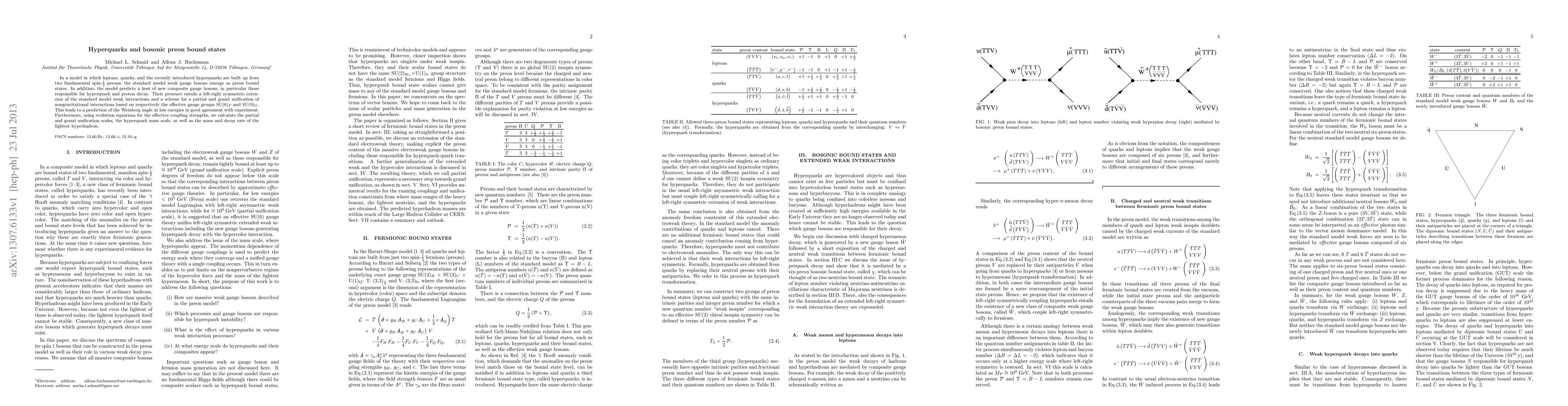 In a model in which leptons, quarks, and the recently introduced hyperquarks are built up from two fundamental spin 1/2 preons, the standard model weak gauge bosons emerge as preon bound states. In addition, the model predicts a host of new composite gauge bosons, in particular those responsible for hyperquark and proton decay. Their presence entails a left-right symmetric extension of the standard model weak interactions and a scheme for a partial and grand unification of nongravitational interactions based on respectively the effective gauge groups SU(6)_P and SU(9)_G. This leads to a prediction of the Weinberg angle at low energies in good agreement with experiment. Furthermore, using evolution equations for the effective coupling strengths, we calculate the partial and grand unification scales, the hyperquark mass scale, as well as the mass and decay rate of the lightest hyperhadron.