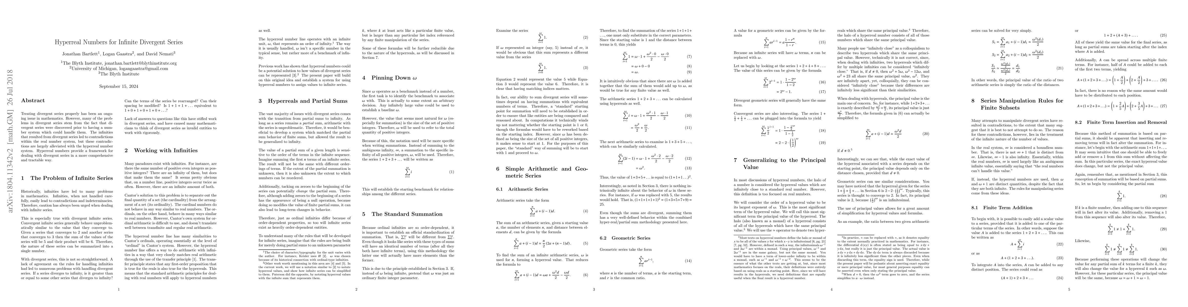 Treating divergent series properly has been an ongoing issue in mathematics. However, many of the problems in divergent series stem from the fact that divergent series were discovered prior to having a number system which could handle them. The infinities that resulted from divergent series led to contradictions within the real number system, but these contradictions are largely alleviated with the hyperreal number system. Hyperreal numbers provide a framework for dealing with divergent series in a more comprehensive and tractable way.