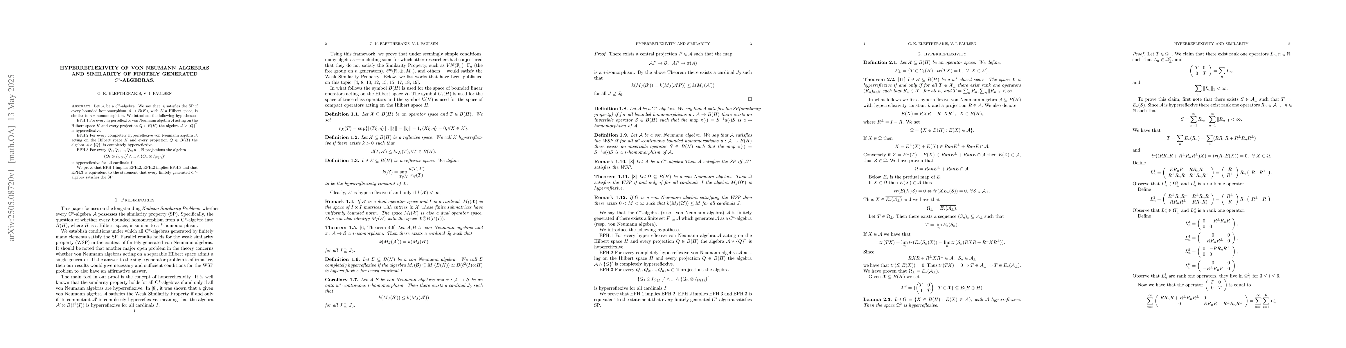 The paper introduces hypotheses EPH.1, EPH.2, and EPH.3 related to hyperreflexivity of von Neumann algebras and proves implications between them, linking these to the similarity property (SP) for finitely generated $C^*$-algebras.