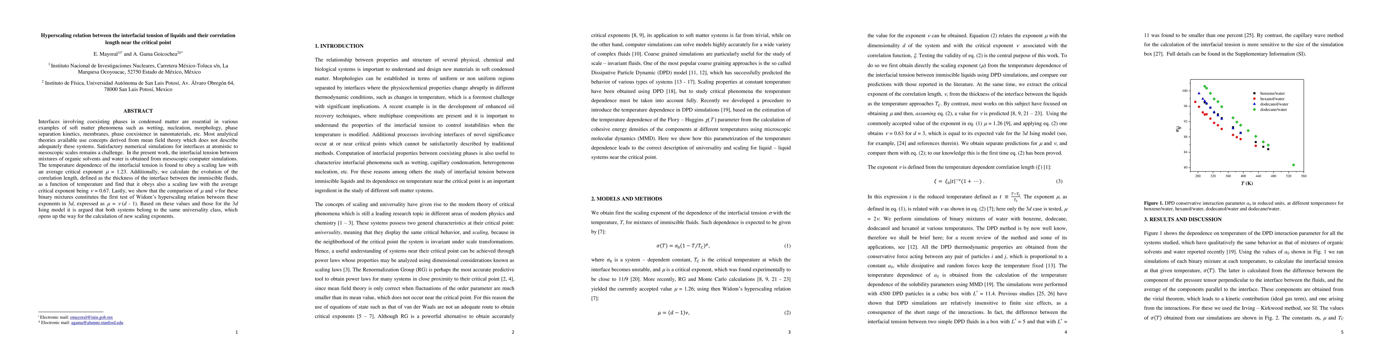 Interfaces involving coexisting phases in condensed matter are essential in various examples of soft matter phenomena such as wetting, nucleation, morphology, phase separation kinetics, membranes, phase coexistence in nanomaterials, etc. Most analytical theories available use concepts derived from mean field theory which does not describe adequately these systems. Satisfactory numerical simulations for interfaces at atomistic to mesoscopic scales remains a challenge. In the present work, the interfacial tension between mixtures of organic solvents and water is obtained from mesoscopic computer simulations. The temperature dependence of the interfacial tension is found to obey a scaling law with an average critical exponent mu = 1.23. Additionally, we calculate the evolution of the correlation length, defined as the thickness of the interface between the immiscible fluids, as a function of temperature and find that it obeys also a scaling law with the average critical exponent being nu = 0.67. Lastly, we show that the comparison of mu and nu for these binary mixtures constitutes the first test of Widom hyperscaling relation between these exponents in 3d, expressed as mu = nu (d - 1). Based on these values and those for the 3d Ising model it is argued that both systems belong to the same universality class, which opens up the way for the calculation of new scaling exponents.