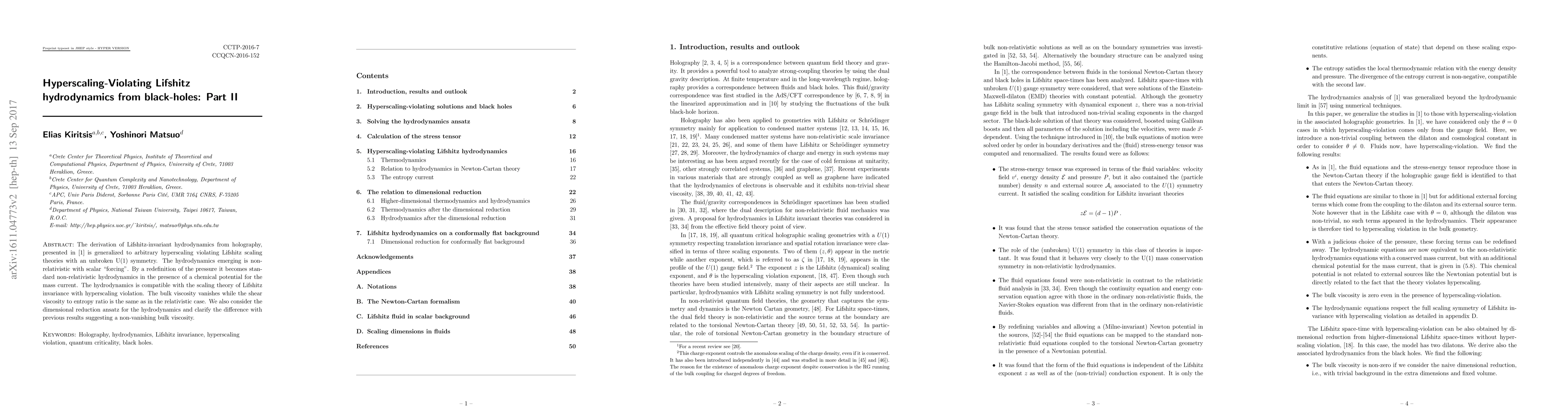 The derivation of Lifshitz-invariant hydrodynamics from holography, presented in [arXiv:1508.02494] is generalized to arbitrary hyperscaling violating Lifshitz scaling theories with an unbroken U(1) symmetry. The hydrodynamics emerging is non-relativistic with scalar "forcing". By a redefinition of the pressure it becomes standard non-relativistic hydrodynamics in the presence of specific chemical potential for the mass current. The hydrodynamics is compatible with the scaling theory of Lifshitz invariance with hyperscaling violation. The bulk viscosity vanishes while the shear viscosity to entropy ratio is the same as in the relativistic case. We also consider the dimensional reduction ansatz for the hydrodynamics and clarify the difference with previous results suggesting a non-vanishing bulk viscosity.